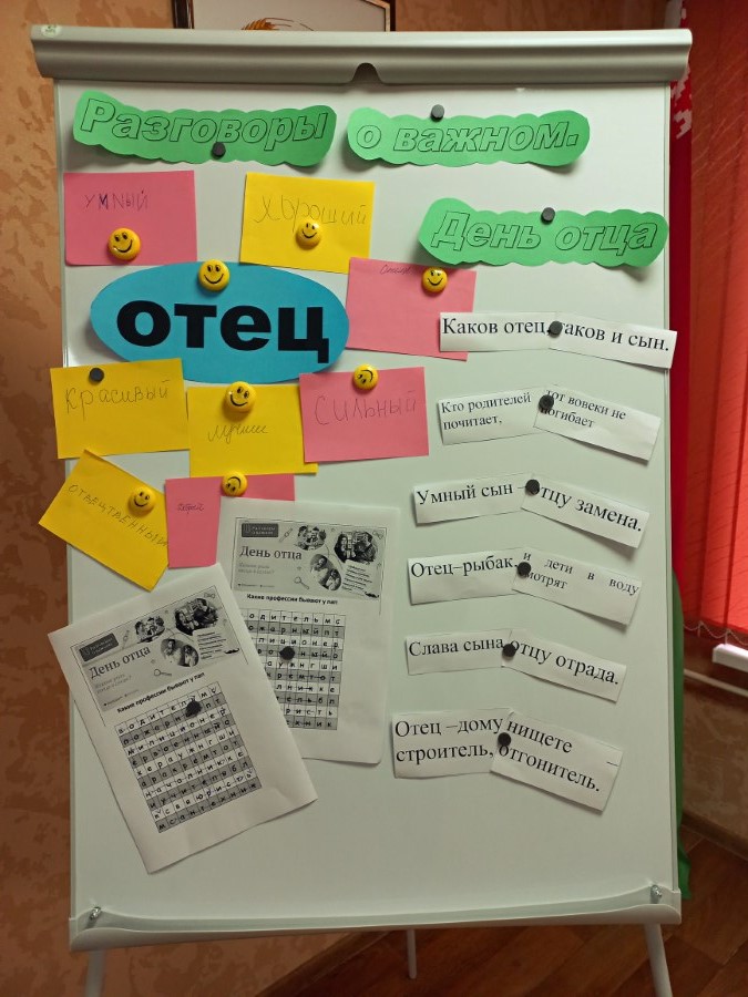Во время мероприятия ребята обсудили, кто такой папа, какими качествами он должен обладать, какова его роль в семье. Также молодые людивспомнили пословицы и поговорки о самых близких людях, а в ходе разгадывания филворда – о многообразии мужских профессий. Взавершении разговора прозвучали слова благодарности всем папам нашей страны, искренние поздравления с праздником и пожелания здоровья, благополучия и любви.