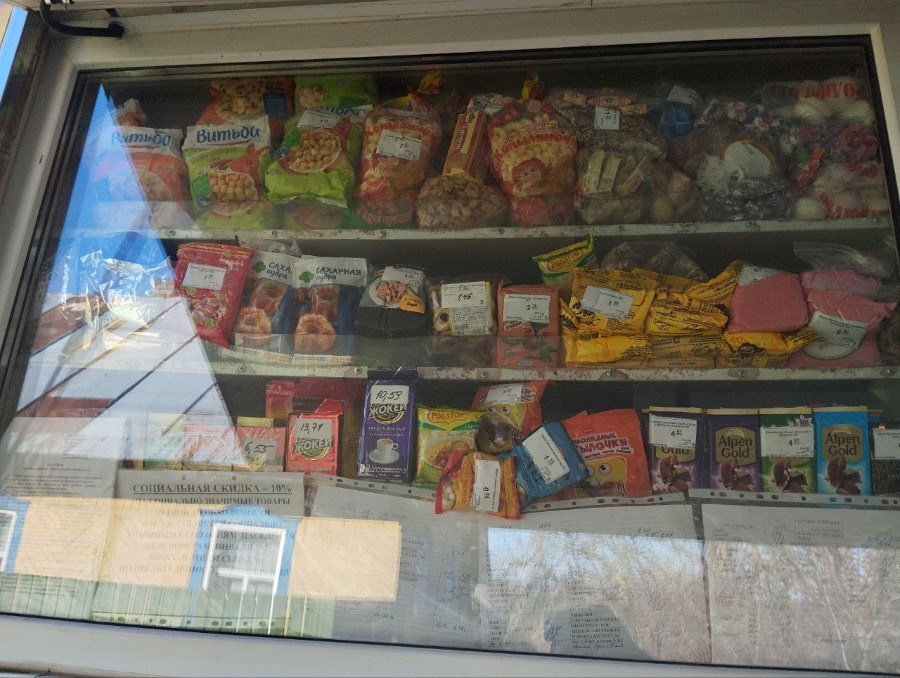 Есть молочная продукция, уксус, спички, колбасные изделия, сладости, одним словом, все товары первой необходимости.... Нет табачных изделий и кур.
