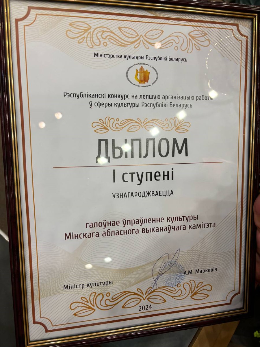 Главное управление культуры Минского облисполкома удостоено высокой награды - 1 место в республиканском конкурсе среди управлений культуры других регионов страны.