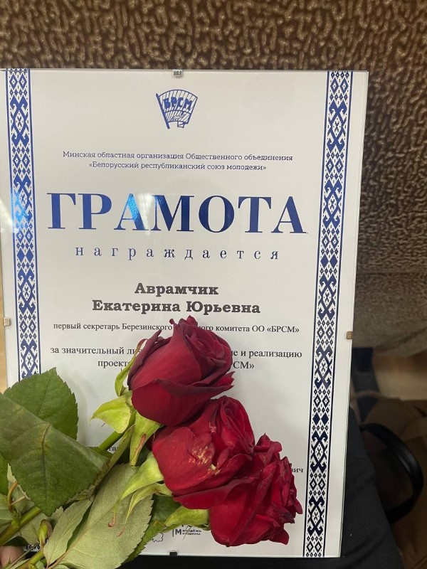 Грамота за значительный личный вклад в развитие и реализацию проектов и программ ОО БРСМ отмечен первый секретарь Березинского РК БРСМ Екатерина Аврамчик!