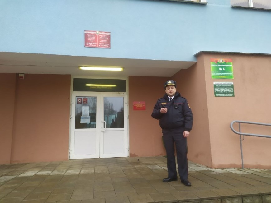На избирательном участке в здании средней школы 3 за порядком следит милиционер Алексей Литвинов.