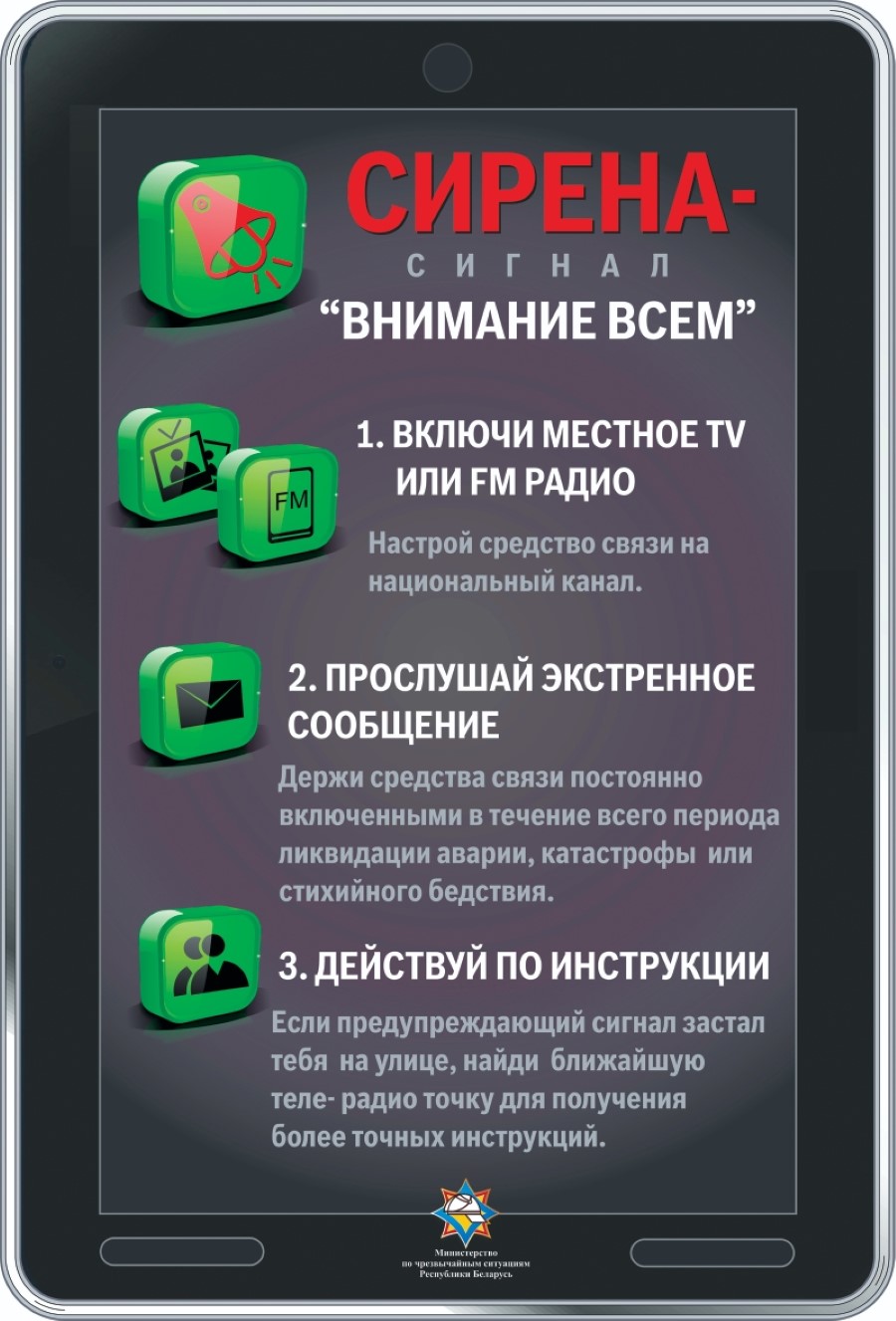 МЧС напоминает: при сигнале гражданской бороны «Внимание всем!», который представляет собой звук сирены, необходимо включить любое средство массовой информации – радио, телевидение и прослушать информацию, действовать согласно полученным инструкциям. Обращайте внимание на сообщения, рассылаемые МЧС на мобильные телефоны.