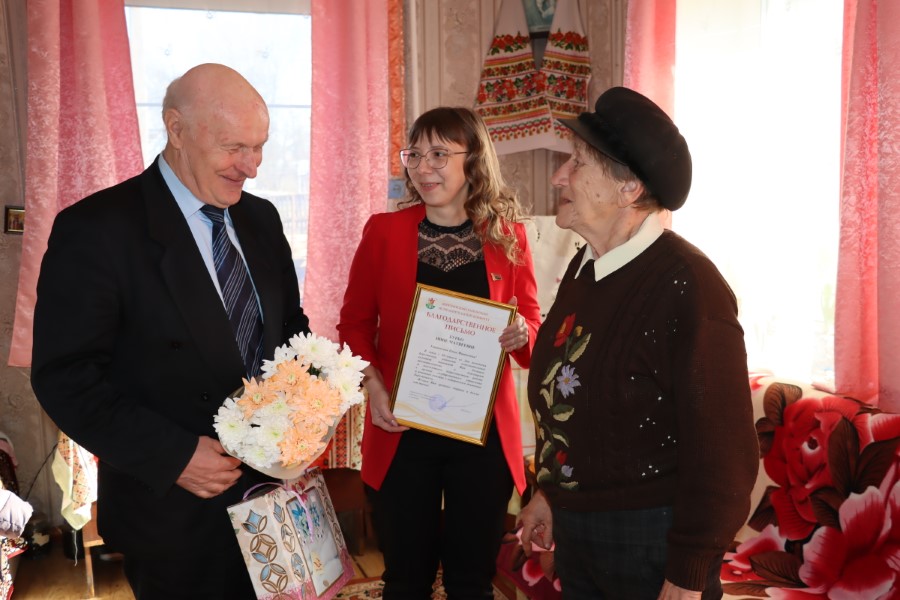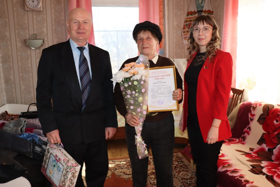 Председатель районного совета ветеранов Анатолий Зябко и начальник управления по труду, занятости и социальной защиты Березинского райисполкома Вероника Джигеро поздравили Нину Матвеевну и вручили благодарственное письмо Березинского районного исполнительного комитета с выражением признательности «за многолетнюю добросовестную работу в органах государственного управления и активное участие в ветеранском движении Березинщины».