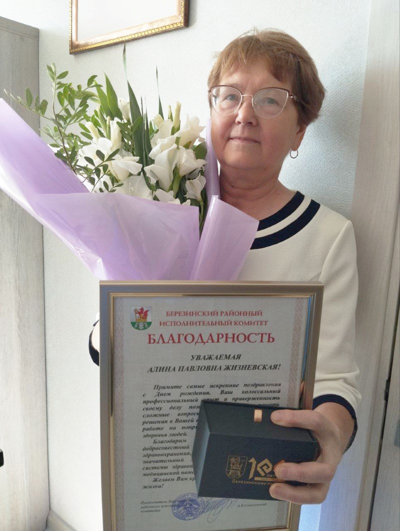 Алина Жизневская вот уже около сорока лет работает в Березинской ЦРБ. Двенадцать из них она занимала пост главного врача. Высокая оценка ее труда – медаль «За трудовые заслуги», полученная в 2015 году из рук Президента.