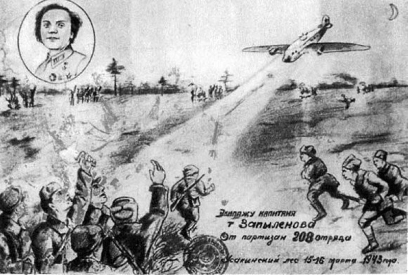 На картине в верхнем углу был изображен портрет Валентины Гризодубовой на фоне заходящего на посадку самолета и встречающих его с партизанским приветом бойцов отряда. На картине была надпись: «Экипажу Запыленова от партизан 208-го отряда. Усакинский лес. 15-16 марта 1943 года».
