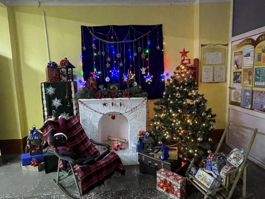 Помимо иллюминации на фасаде и прилегающей территории, в фойе первого этажа организована фотозона с неизменными новогодними атрибутами: ëлкой, часами, камином, креслом-качалкой. Благодаря совместным усилиям учащихся и учителей, школа преобразилась и наполнилась праздничным духом. Новогодние украшения радуют глаз и создают атмосферу ожидания чудес.