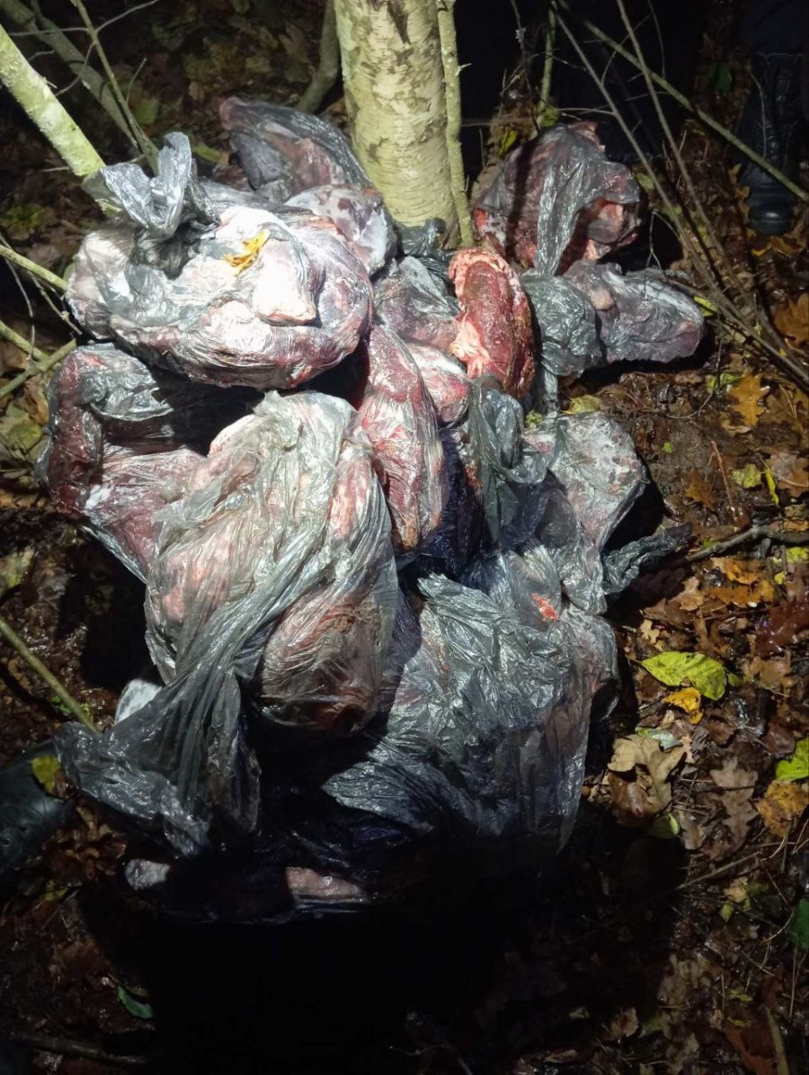 У горе-охотника изъяты мобильный телефон с изображением лося, находящегося в петле, с указанием даты, когда было сделано фото. Из указанного им схрона, изъято 105 кг мяса, предположительно дикого животного, лося.