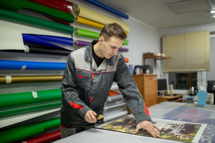 Когда обратился первый клиент, оказалось, что рекламный баннер на лайтбокс тоже надо кому-то отрисовать. Тогда Марине пригодились знания, которые ей преподавали в университете – менеджмент, реклама и основы дизайна. В результате на обычном ноутбуке родился первый рекламный макет для магазина “Эконом”. Со временем клиентов прибавлялось, а супруги поняли, что хочется создавать своими руками что-то более значимое. Александр ушёл с РОВД, открыл ИП и на первое время устроился на полставки сторожем “для поддержания штанов”. Первую вывеску, вспоминают сегодня, клеили вдвоём в ночную смену мужа. На работу ушла вся ночь, а результат оказался достойным того, чтобы получить еще один аналогичный заказ.