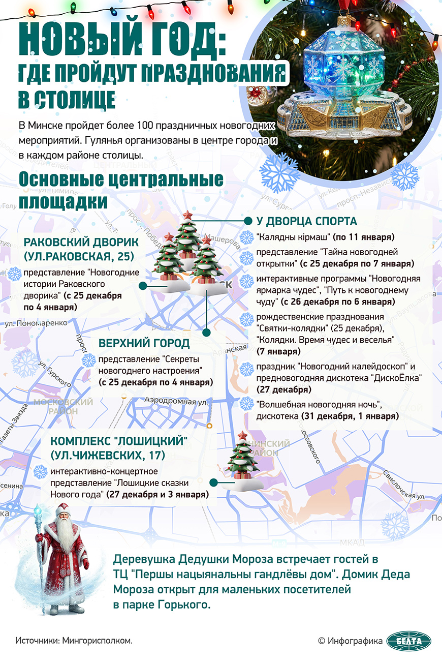 В саму новогоднюю ночь будут работать около 20 площадок в районах Минска. Основная же городская локация расположится у Дворца спорта. Туда стоит приходить 1 января с 00.10 до 4.00. Продолжится программа с 20.00 до 23.00.