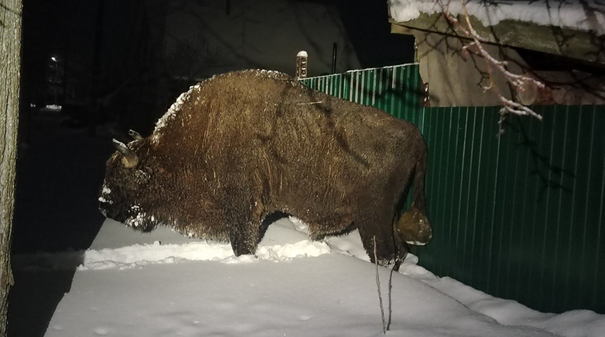 "Мы бросали ему хлеб, кукурузу, свеклу, но он ничего не ел. Просто стоял, даже не шелохнулся", - рассказывает Елена. Позже животное легло отдохнуть под деревом возле гаража и проспало там до двух часов ночи. Предположительно в это время зубр и ушел. К утру его в деревне уже не было - лишь следы на снегу указывали, что он направился в сторону соседнего населенного пункта.