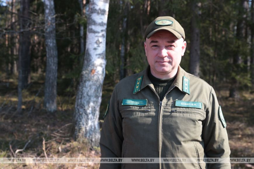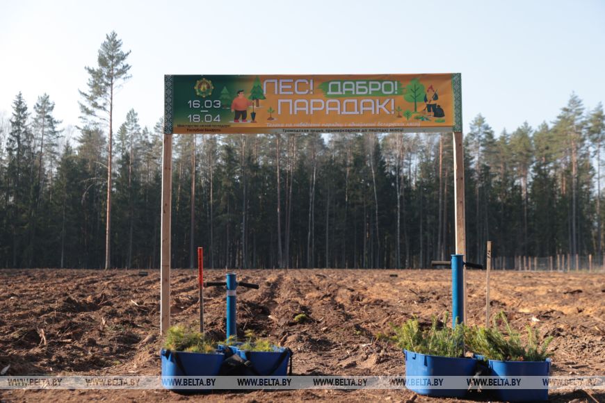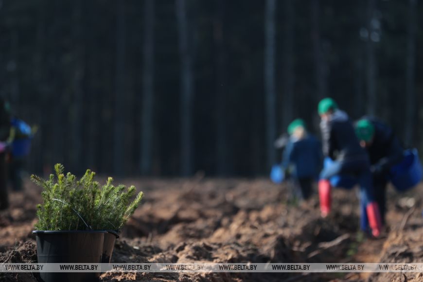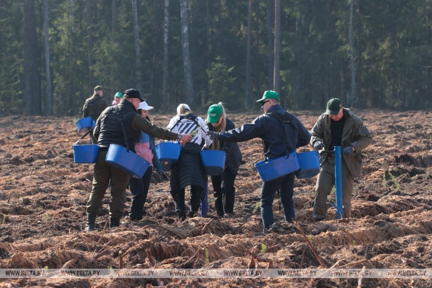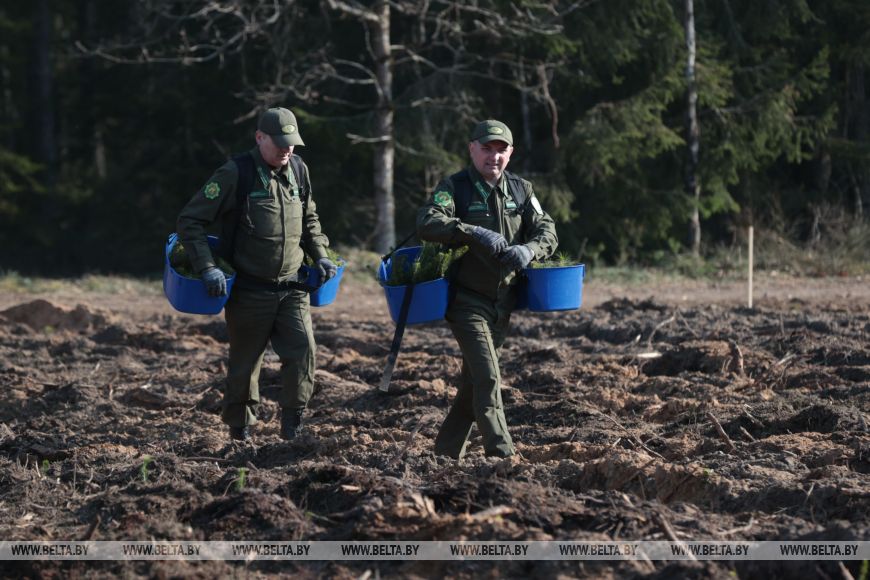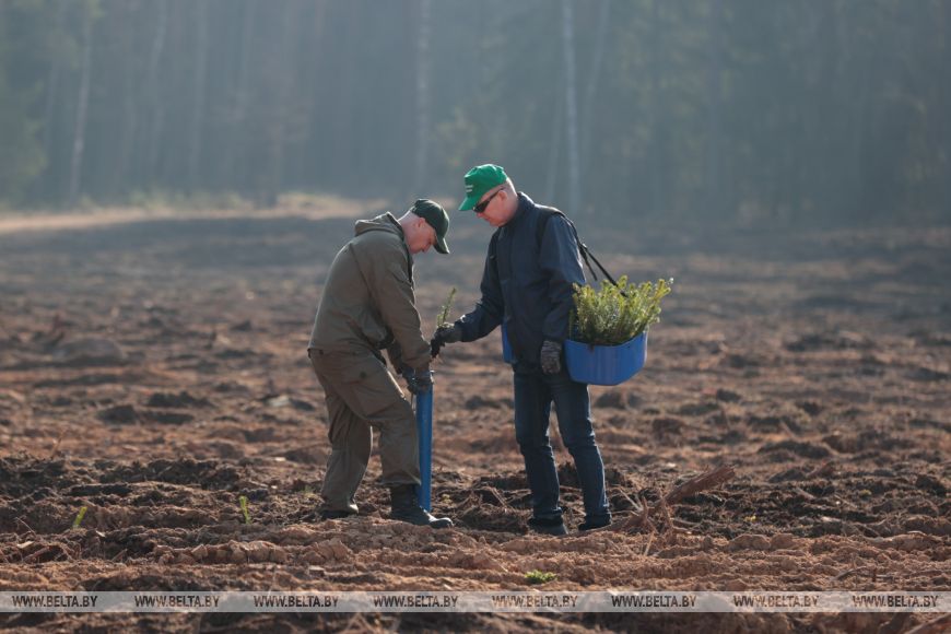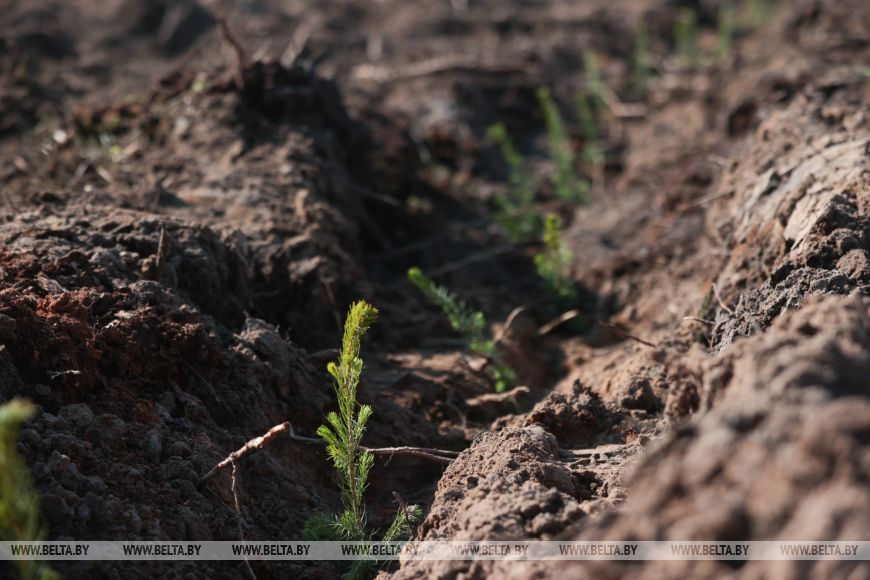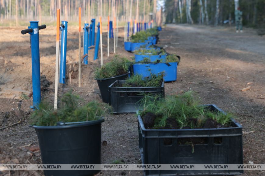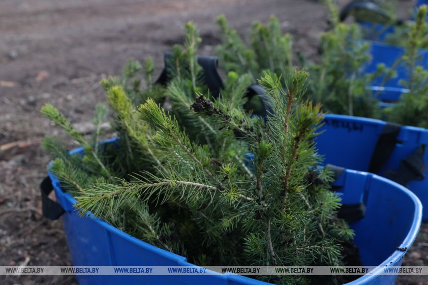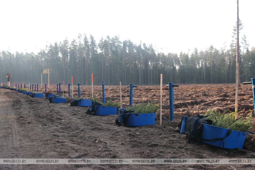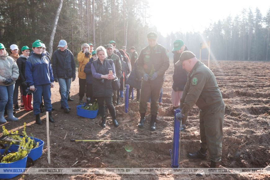 Главный лесничий Столбцовского опытного лесхоза Виктор Бобко рассказал, что до этого на данном участке была произведена вырубка леса, а сегодня уже новые деревья занимают места своих предшественников. "Сегодня высаживаем сосну и ель - создаем лесные культуры посадочным материалом закрытой корневой системой густотой", - добавил он.