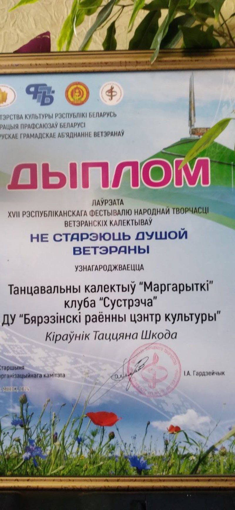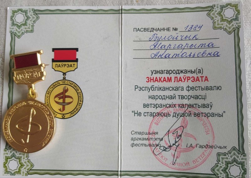 А не так давно мастерству наших танцовщиц рукоплескали и столичные зрители. И не только рукоплескали, но и отметили достойными наградами их мастерство и талант. А состоялось это в канун праздника Дня Победы, 7 мая, во время проведения XVII республиканского фестиваля народного творчества ветеранских коллективов «Не стареют душой ветераны». На нем наши «Маргаритки» были признаны лауреатами конкурса, что подтверждает врученный Диплом, а также медали лауреатов, которыми отмечены все члены коллектива.