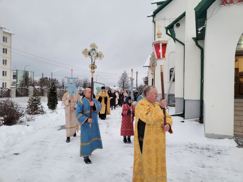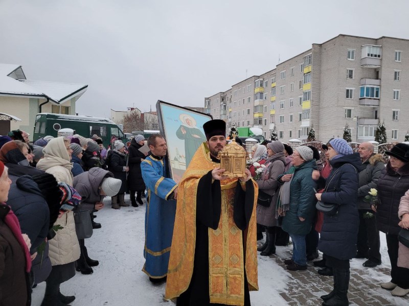 У входа в храм святыни встретили благочинный протоиерей Илья Гончарук, настоятель Преображенского храма иерей Василий Васильков и верующие жители города и района. Под колокольный звон Крестным ходом святыни были обнесены вокруг храма.