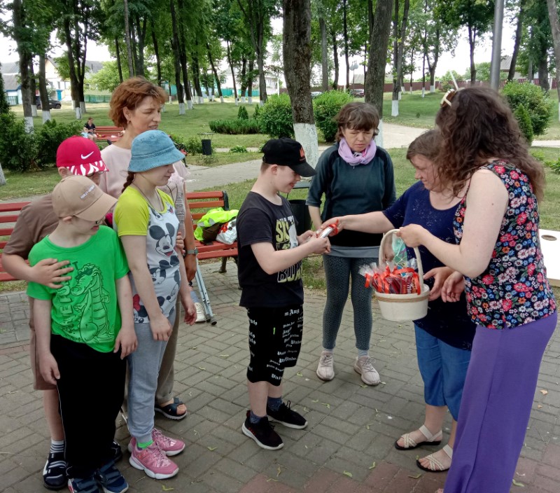В преддверии Международного дня защиты детей в городском парке было шумно и весело. Для учащихся ГУСО «Центр коррекционно-развивающего обучения и реабилитации Березинского района» прошла акция «Этот мир мы дарим детям», организованная посетителями отделения социальной реабилитации, абилитации инвалидов ГУ «Березинский территориальный центр социального обслуживания населения».