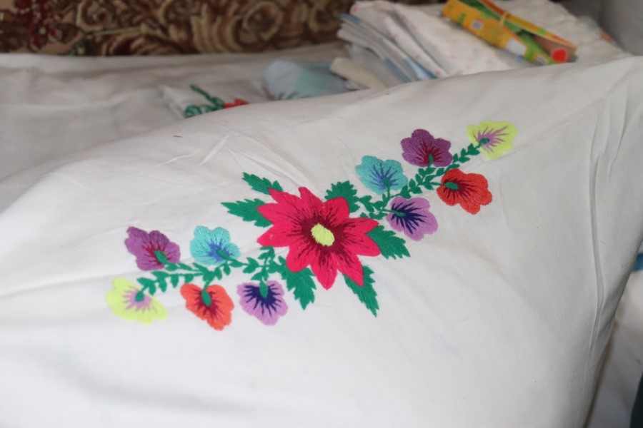 Одна из жительниц д. Котово, Валентина Трофимовна Ковалева, родившаяся в Костюковичском районе и оказавшаяся на Березинщине в числе переселенцев в результате аварии на ЧАЭС, с удовольствием продемонстрировала нам свои «вышиванки», которыми она увлекается не одно десятилетие и которыми украшены многие предметы ее быта.