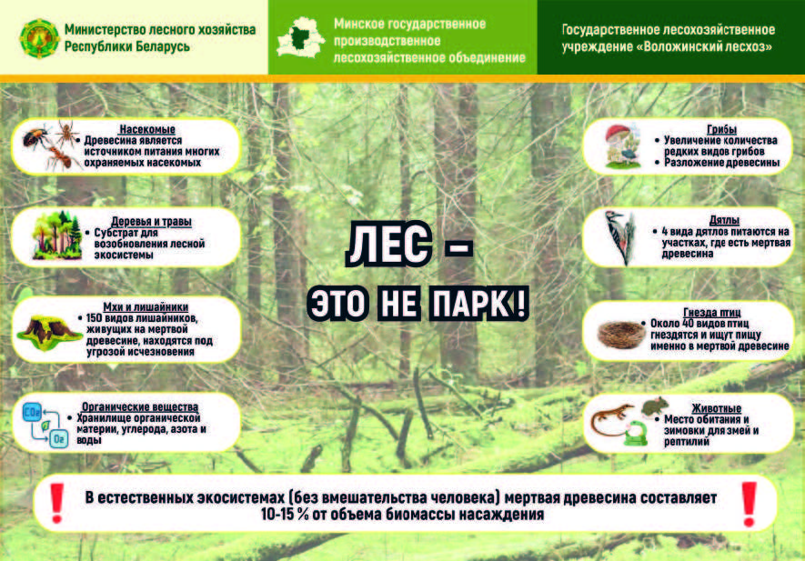Каждому гостю должно быть понятно, что жизнь в лесу непрерывна и подчинена своему созидательному порядку и преемственности. Оставляя здесь некоторое количество мертвой древесины, представленной различными стадиями разложения, мы помогаем поддерживать его устойчивость. Если удаляем из леса валежник и сухостой, не давая ему превратиться в гумус, то тем самым снижаем плодородие почвы.