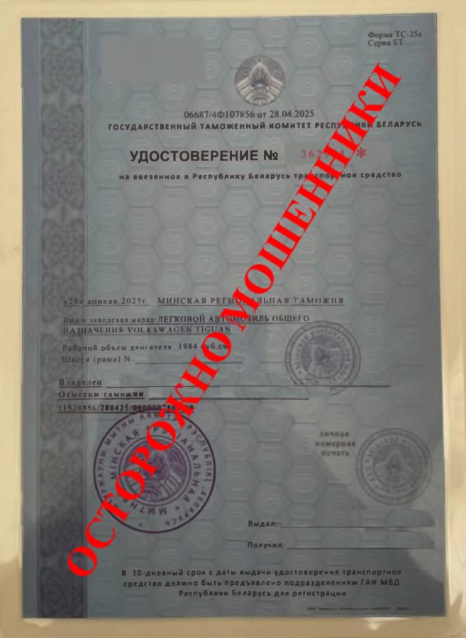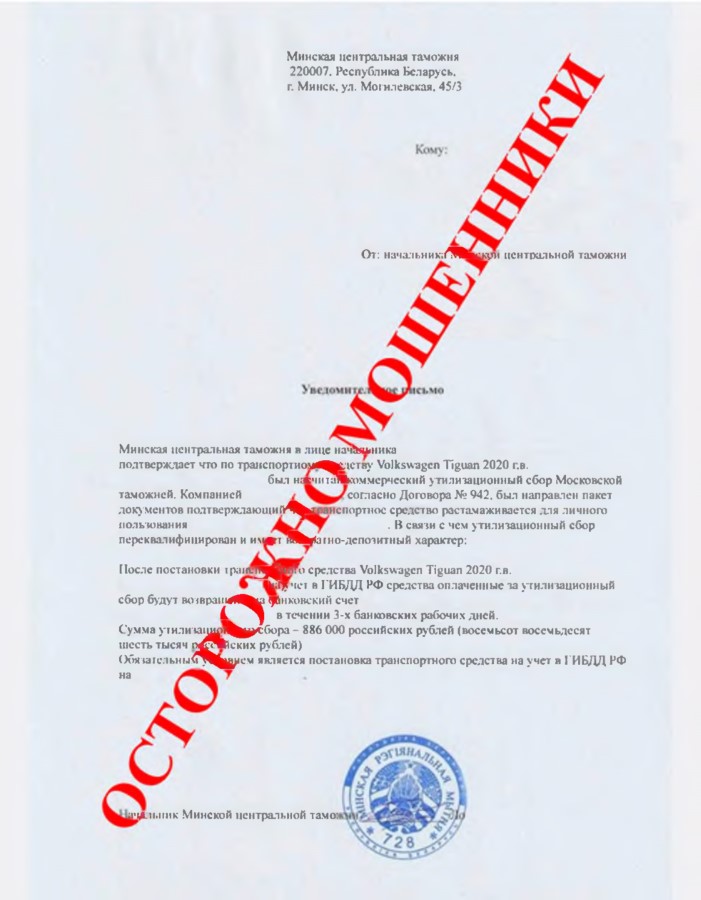 Впоследствии обманутые граждане просят уточнить таможенное оформление транспортных средств с приложением копий таможенных приходных ордеров, удостоверений на ввезенные транспортные средства, квитанций об оплате, уведомительных писем об уплаченном утилизационном сборе. Приложенные документы составлены по не установленной законодательством форме, содержат несуществующие реквизиты и являются поддельными.