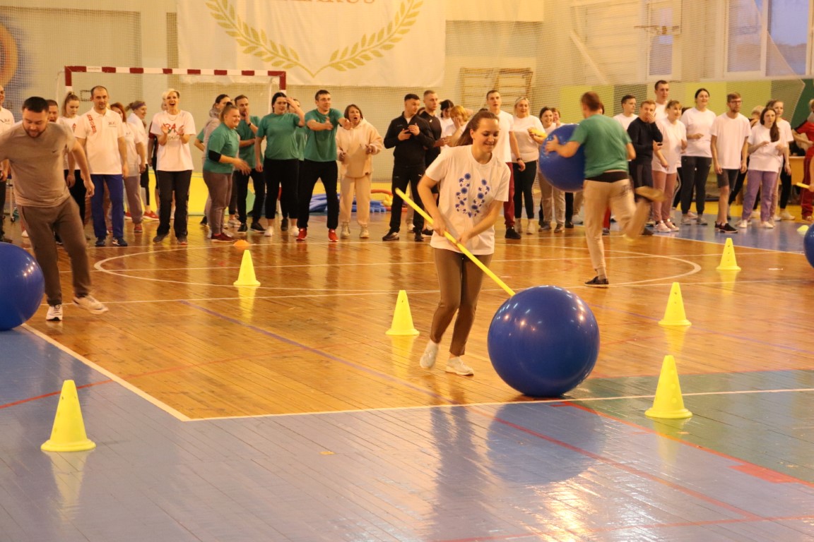 І сапраўды, скакаць у мяхах даволі няпроста, але трэба ведаць кемлівасць сацыяльных работнікаў. Некаторыя з іх умудрыліся замяніць скокі бегам і рабілі гэта вельмі шпарка. А яшчэ былі заданні з выкарыстаннем фітболу і гімнастычнай палкі, абручом і стужкамі, гімнастычным дыванком, нудлам і малым мячом.