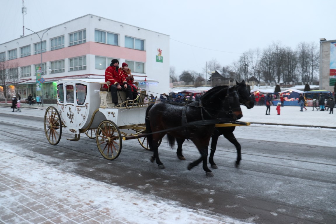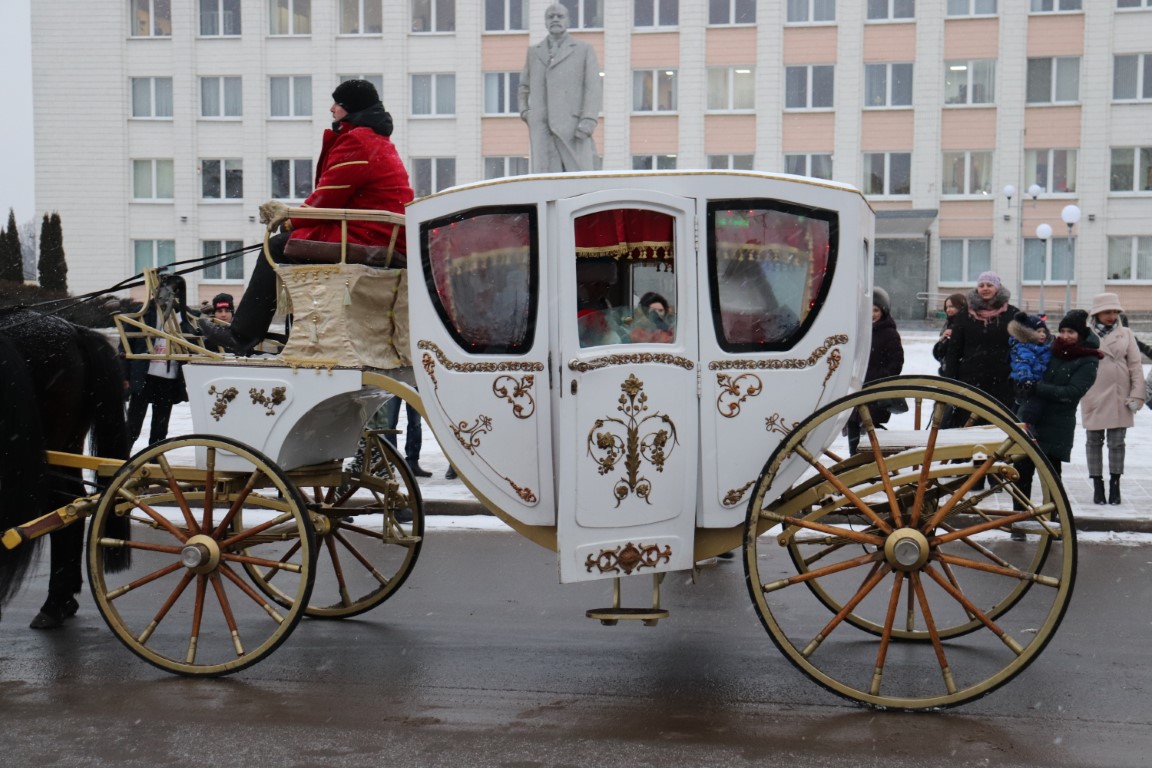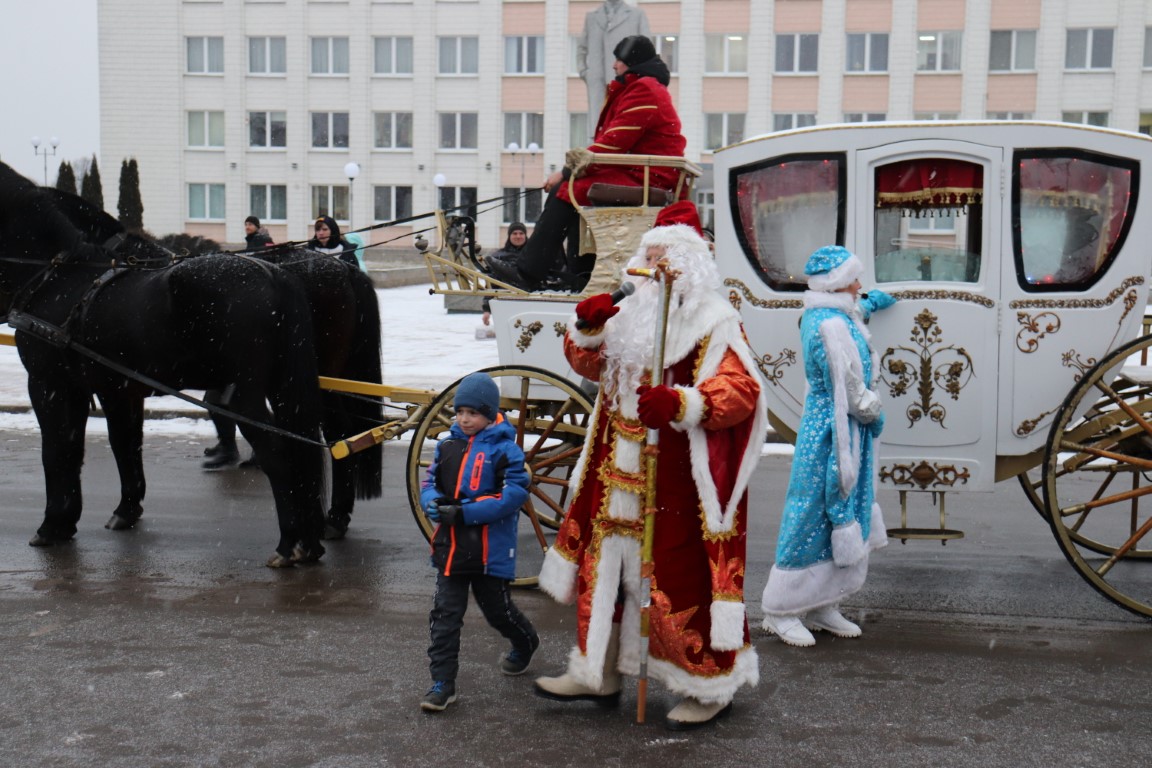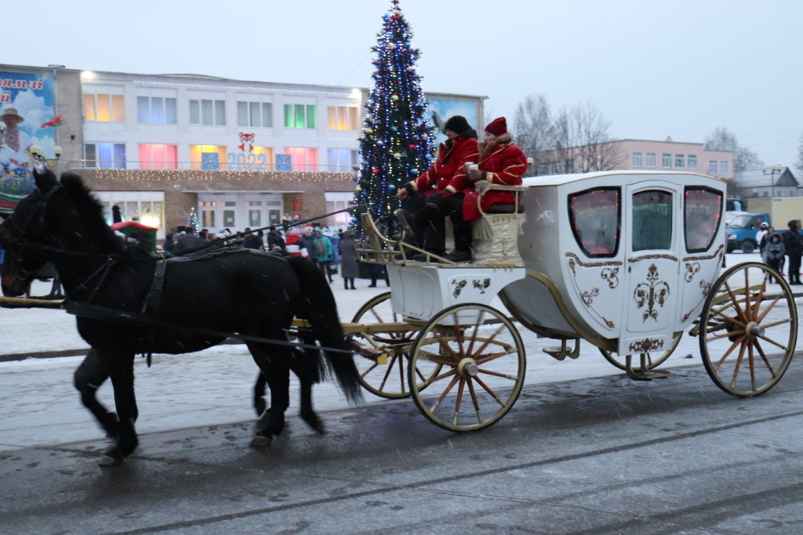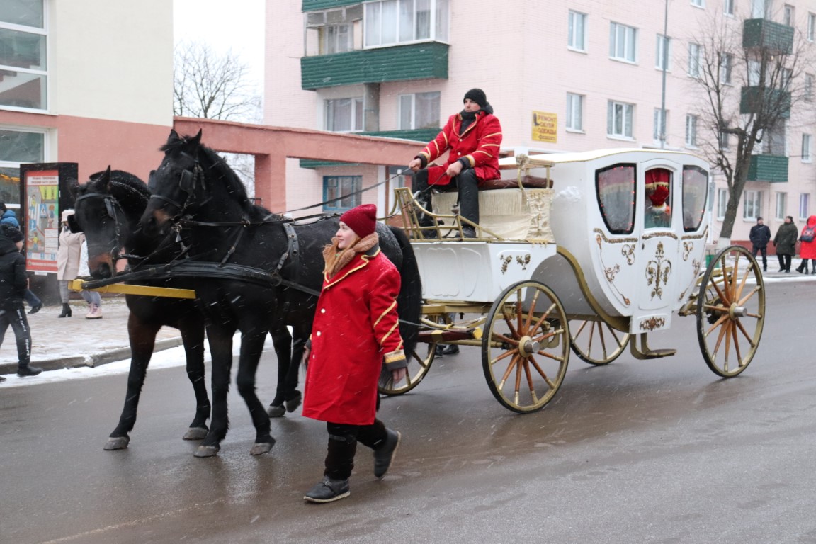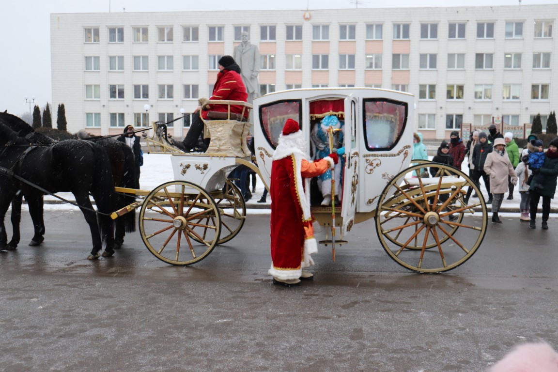 Галоўны Дзед Мароз са Снягуркай прыбылі на цэнтральную плошчу горада ў шыкоўнай карэце пад радасныя воклічы гледачоў.