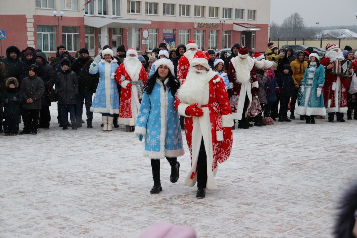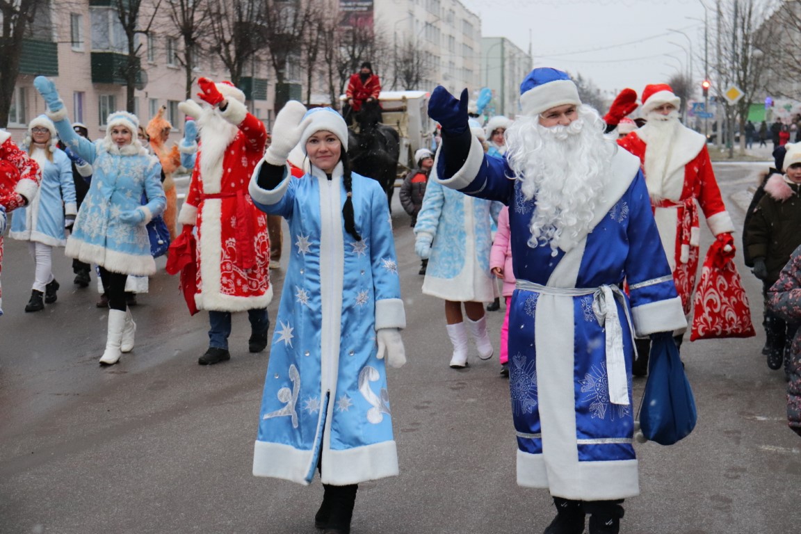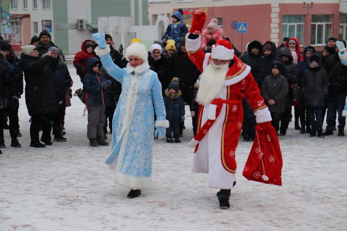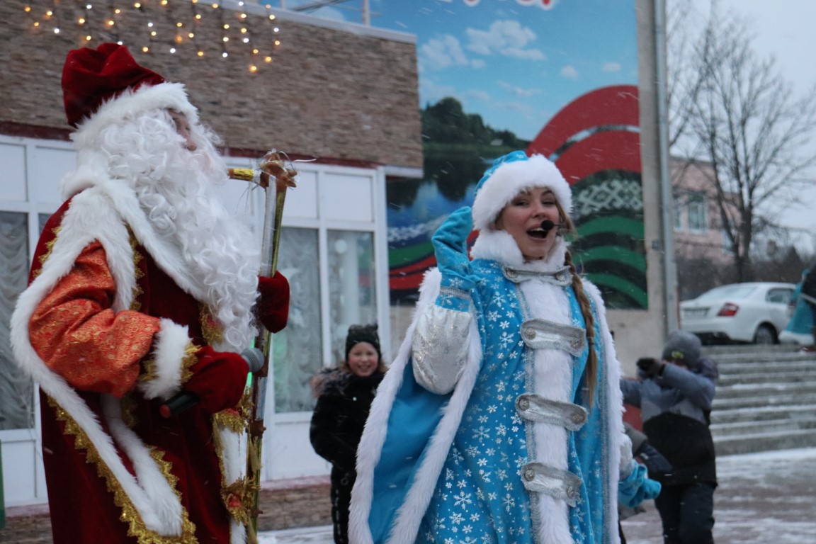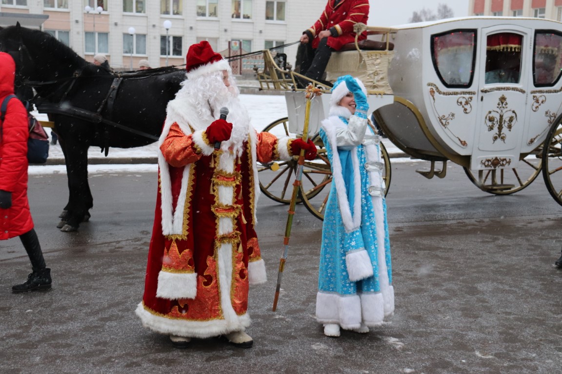 Галоўны Дзед Мароз са Снягуркай прыбылі на цэнтральную плошчу горада ў шыкоўнай карэце пад радасныя воклічы гледачоў.