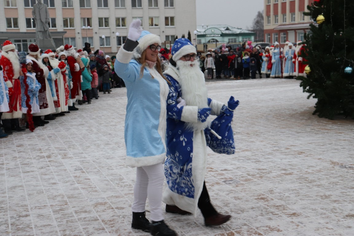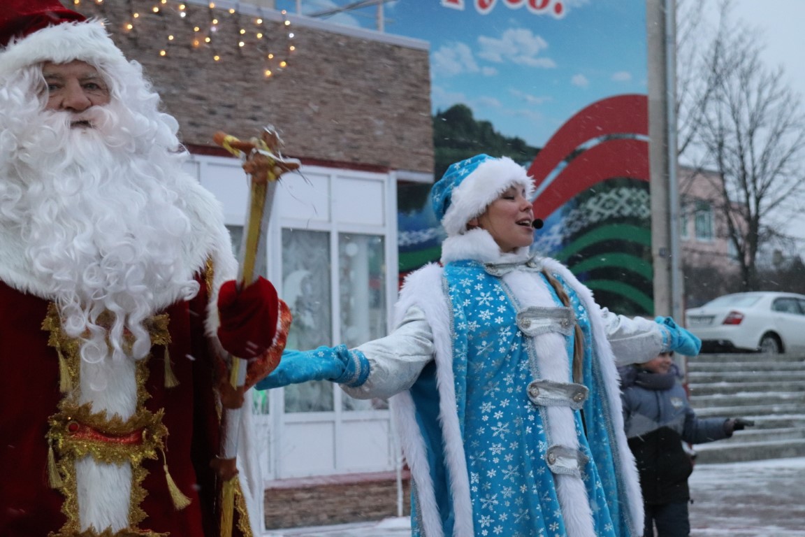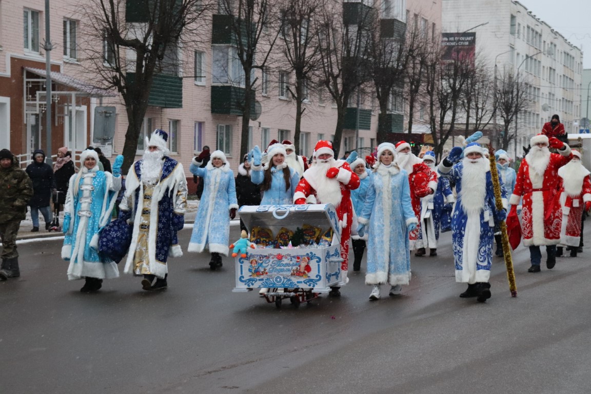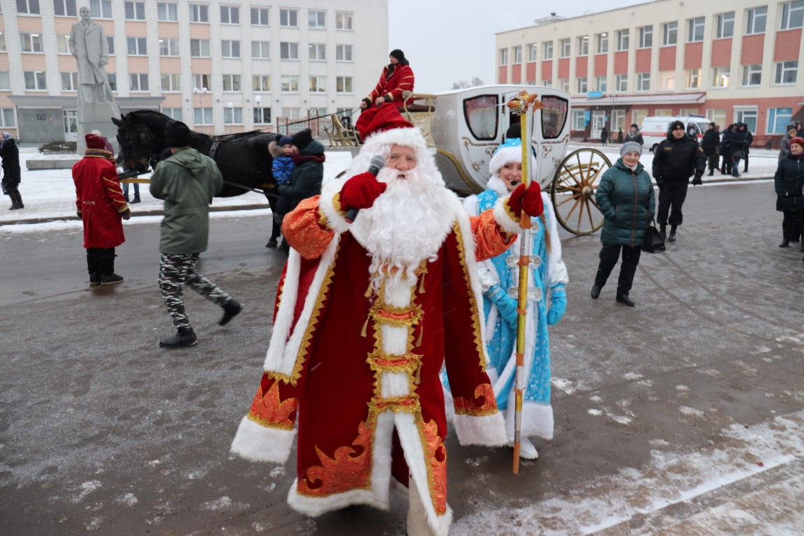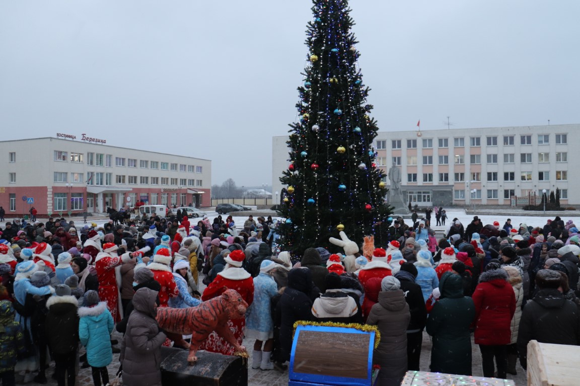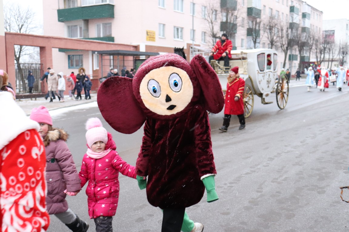 Галоўны Дзед Мароз са Снягуркай прыбылі на цэнтральную плошчу горада ў шыкоўнай карэце пад радасныя воклічы гледачоў.