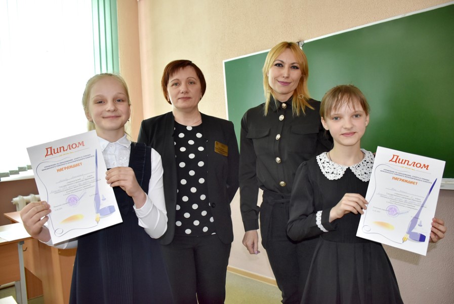 Загадчыца секцыі “Руская мова і літаратура”Алена Аўтуховіч уручае прэстыжны дыплом пераможцы раённага конкурсу работ даследчага характару вучням Брадзецкай СШ Настассі Мохавай і Ксеніі Юнец. Гэтыя пяцікласніцы разам з педагогам Юліяй Міховіч зрабілі і прадставілі журы ўнікальны буклет “Ударим по ударению”, які дапаможа вучням размаўляць правільна і не памыліцца з правапісам