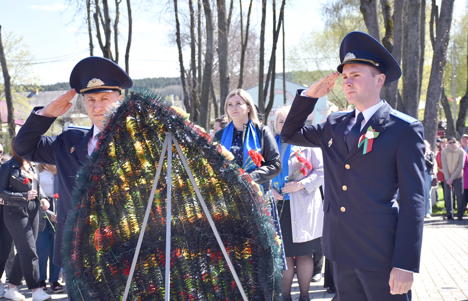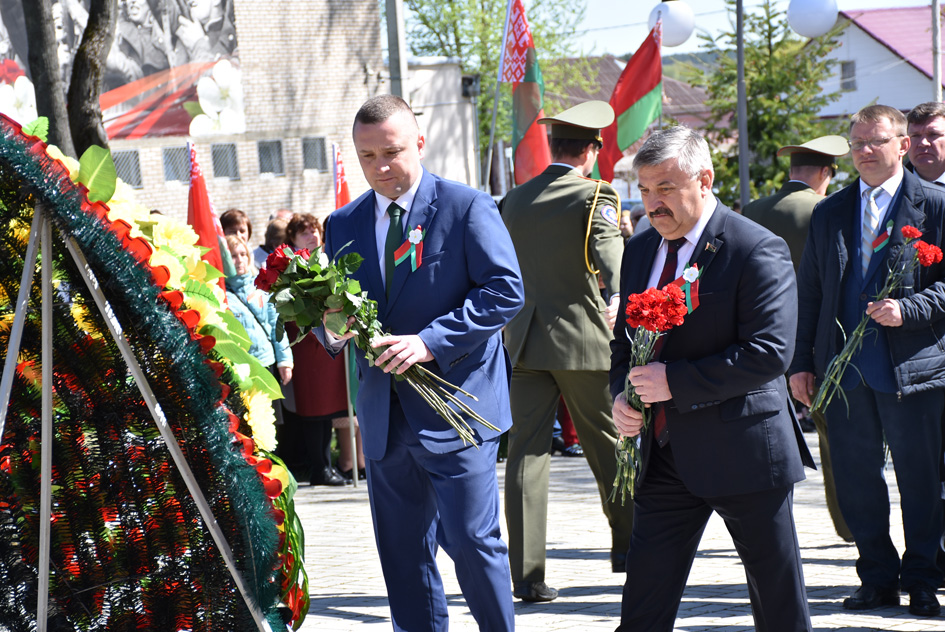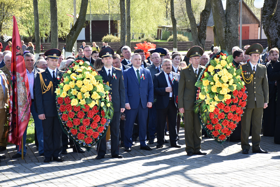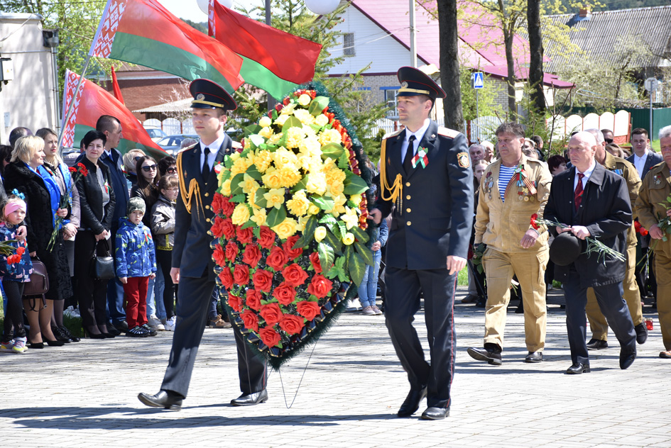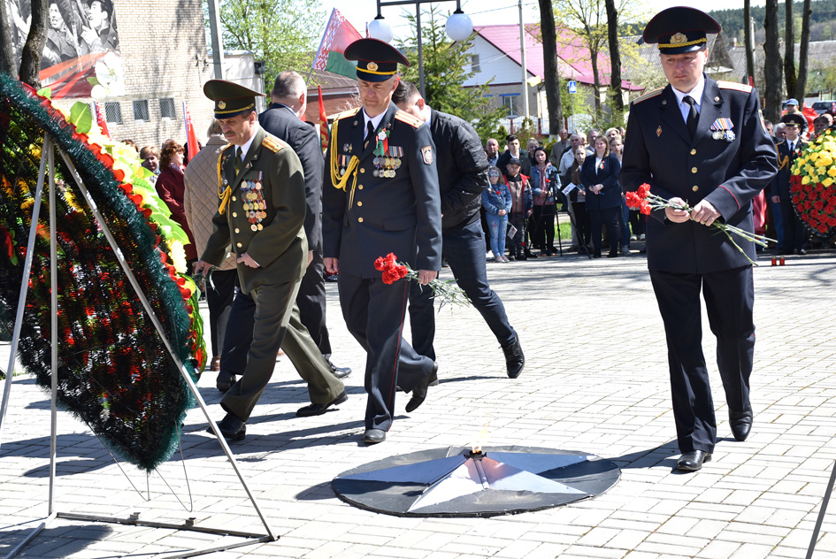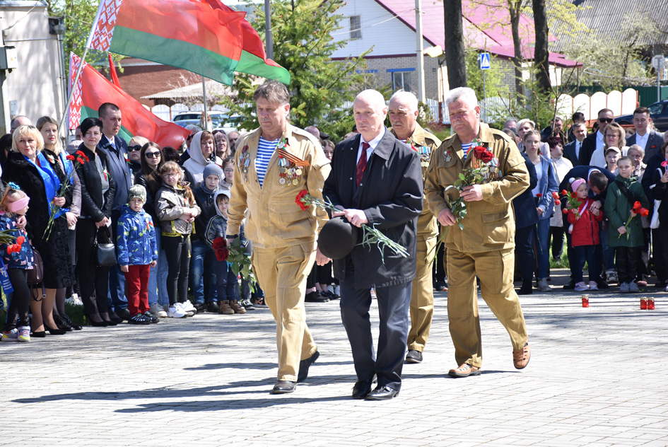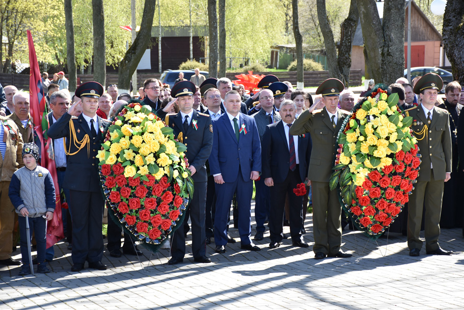 … Хвіліна маўчання. Гулкім рэхам разносіцца па наваколлі залп салюту. Да падножжа помніка загінуўшым героям ускладаюцца вянкі і жывыя кветкі ад раённага выканаўчага камітэта і раённага Савета дэпутатаў, прадпрыемстваў і арганізацый горада, грамадскіх аб’яднанняў, палітычных партый, моладзі і рэлігійных арганізацый, савета ветэранаў.
