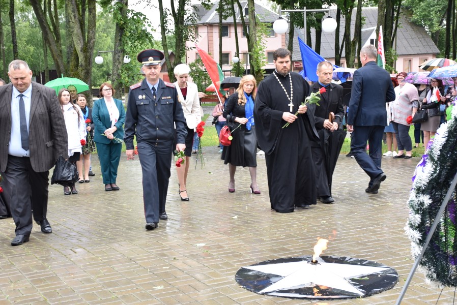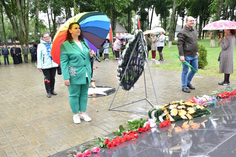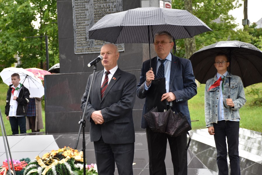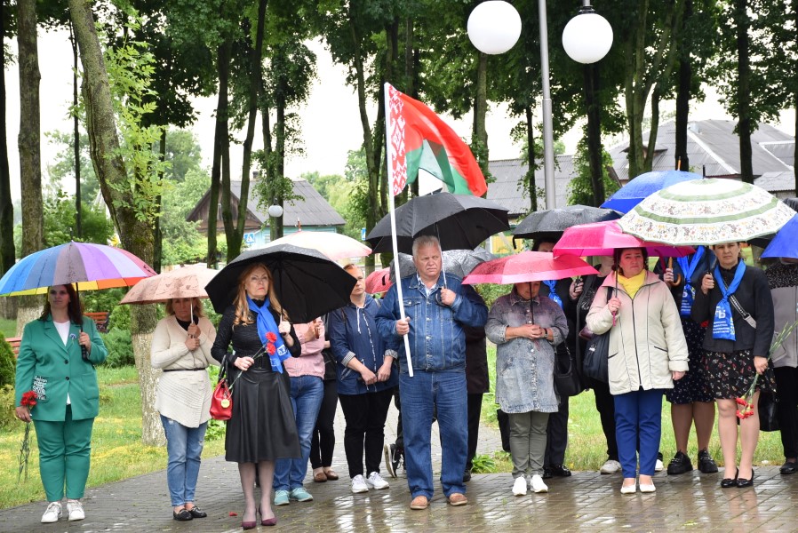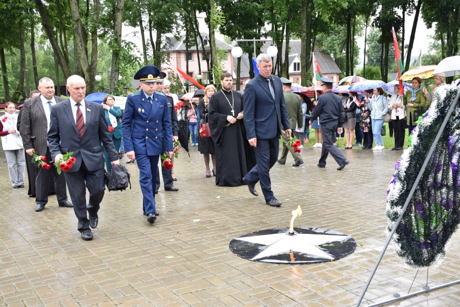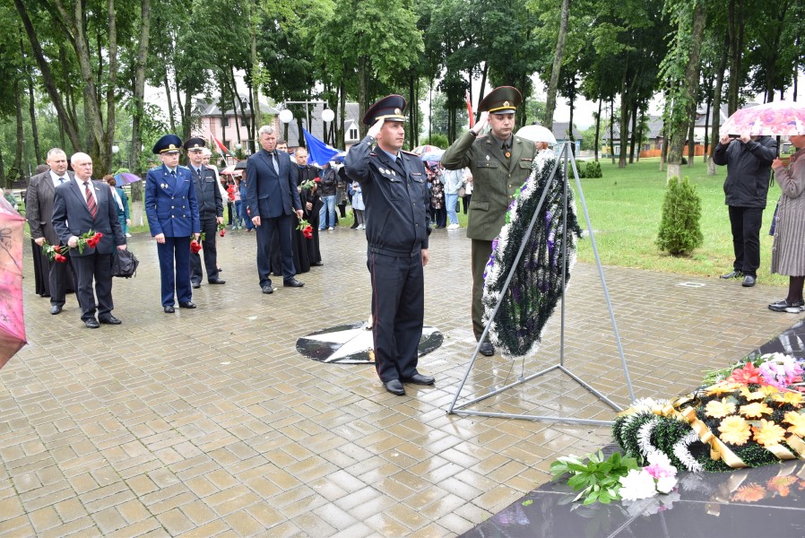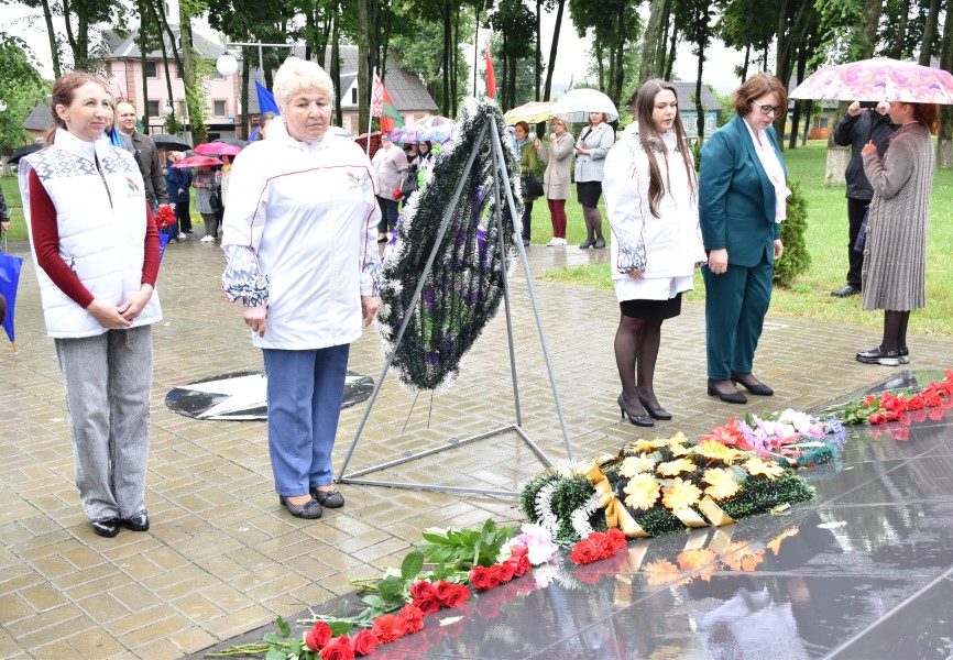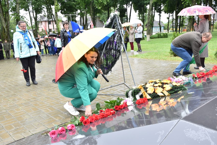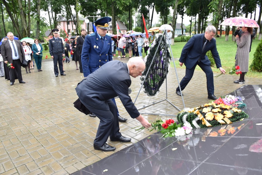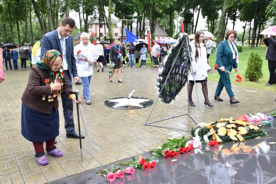 Прадстаўнікі Бярэзінскага райвыканкама, прафсаюзных і ветэранскіх арганізацый, працоўных калектываў, рэлігійных абшчын і БРСМ усклалі кветкі да помніка.