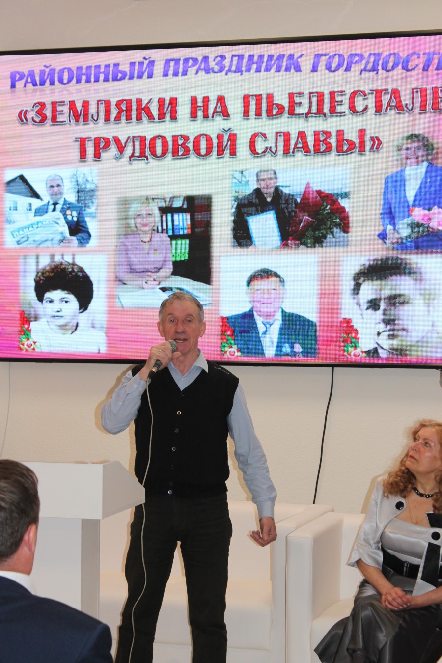 В галерее славных образов, созданных ведущей мероприятия Тамарой Круталевич, было представлено свыше 20 биографий наших земляков и тружеников Березинщины, которые своим трудом прославили нашу малую родину. А открыли ее имена Героев Социалистического труда – уроженцев района. Эстафета затем была передана тем людям, которые за свой труд были отмечены орденами Советского Союза. Немало таких людей на Березинщине, На встрече эту плеяду представляли ветераны труда Александр Ходаренок, Янина Верниковская, а также Иван Соболь, который несмотря на свои 75 лет, по-прежнему трудится в СУП «АгроМАЗ».