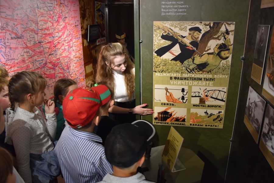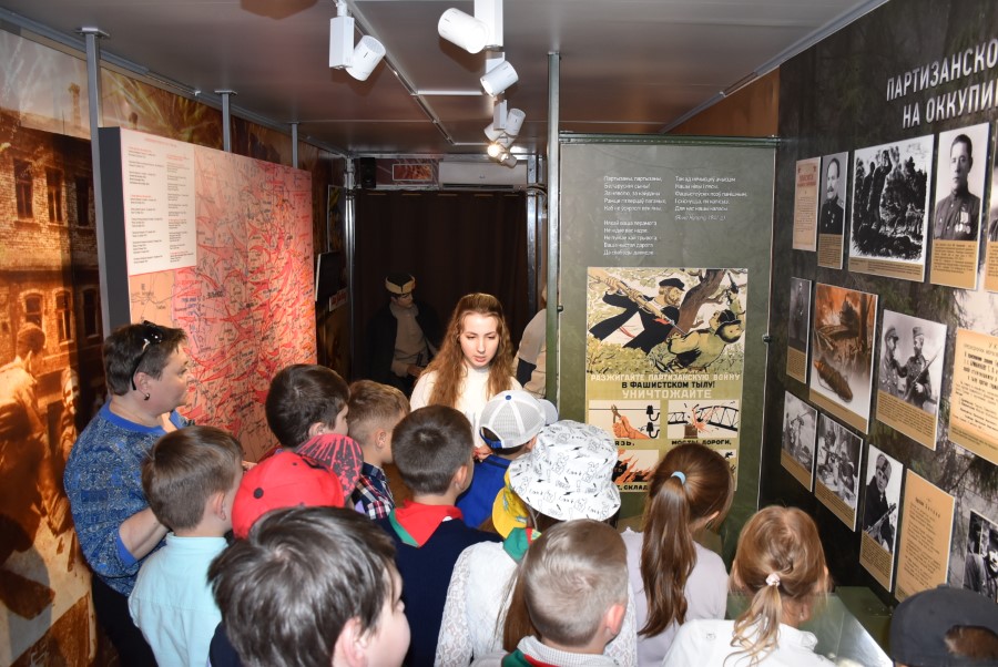 У мабільным музеі прадстаўлены раздзелы, якія распавядаюць аб ваенных дзеяннях на тэрыторыі нашай краіны, партызанах і падпольшчыках, юных патрыётах, што сталі на абарону сваёй Радзімы ад ворагаў.