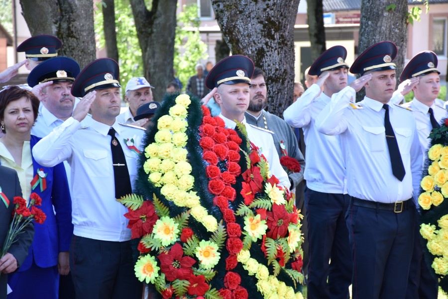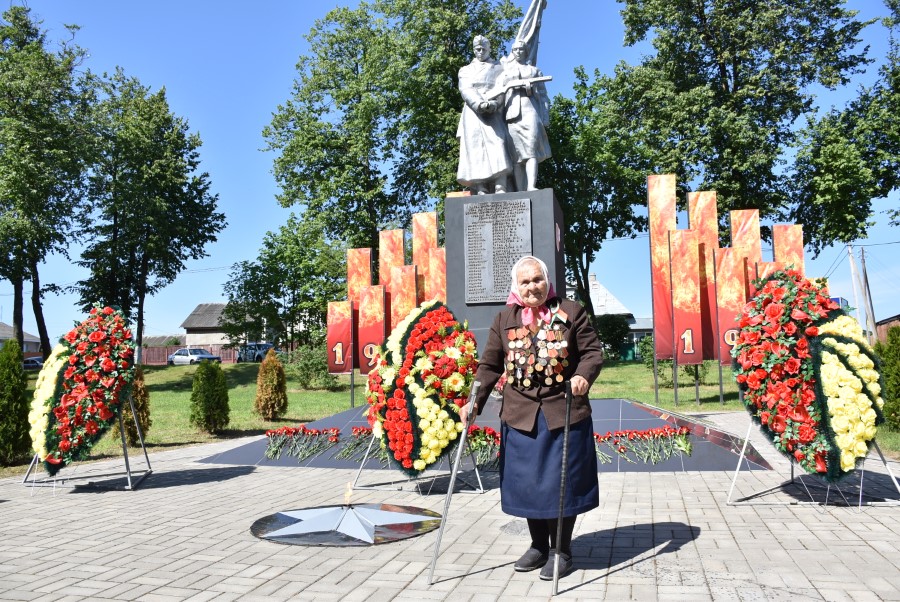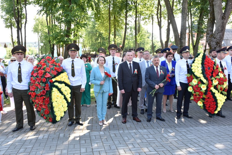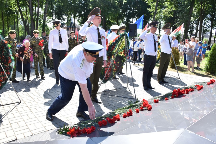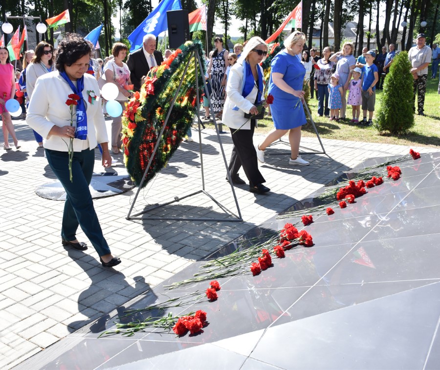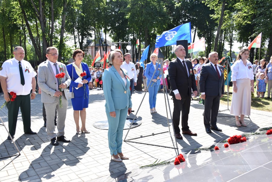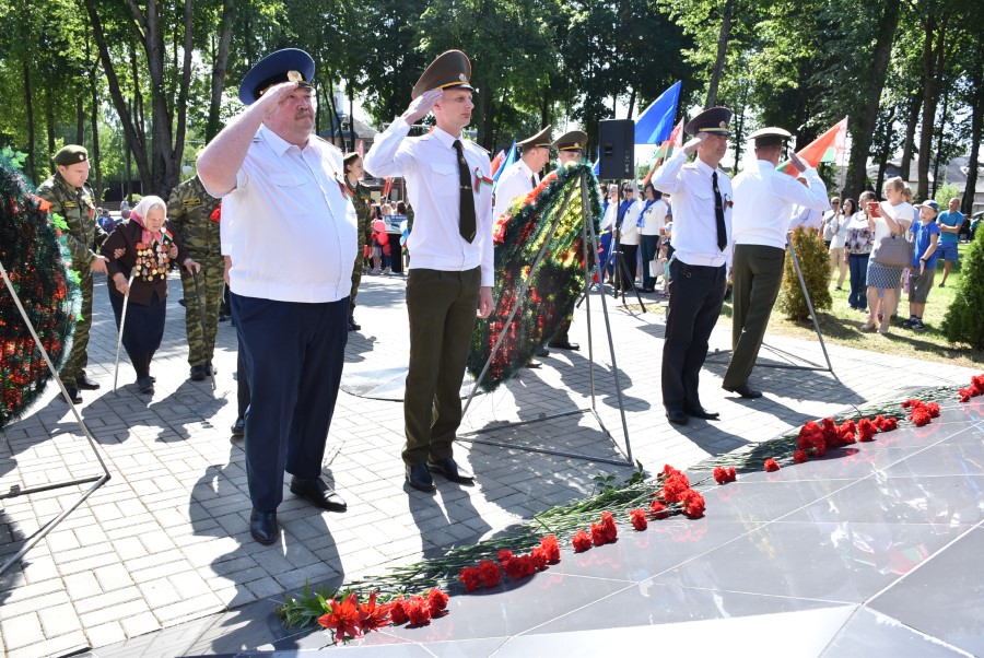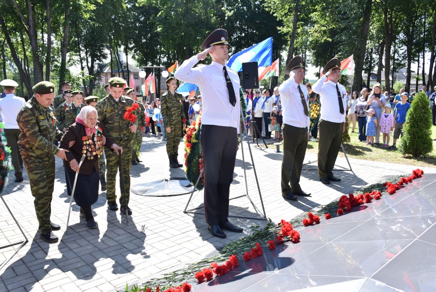 … Хвіліна маўчання. Гулкім рэхам разносіцца па наваколлі залп салюту. Да падножжа помніка загінуўшым героям ускладаюцца вянкі і жывыя кветкі ад раённага выканаўчага камітэта і раённага Савета дэпутатаў, прадпрыемстваў і арганізацый горада, грамадскіх аб’яднанняў, палітычных партый, моладзі і рэлігійных арганізацый, савета ветэранаў.