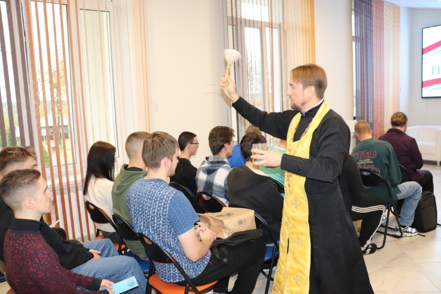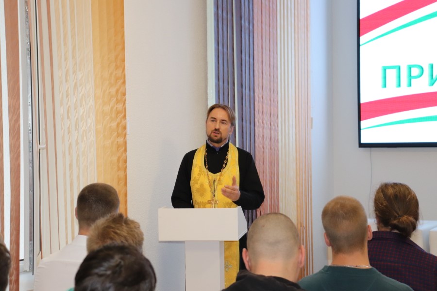 В завершении мероприятия взял слово настоятель Преображенского храма иерей Василий Васильков. Отец Василий вспомнил о старинной традиции благословлять защитников Отечества, раздал каждому памятки с псалмом 90 из Библии и окропил святой водой.