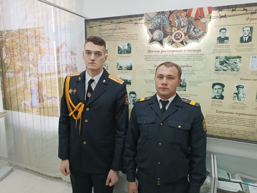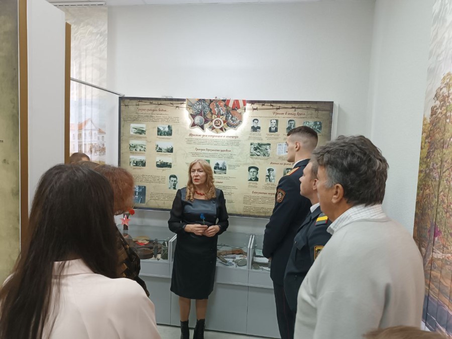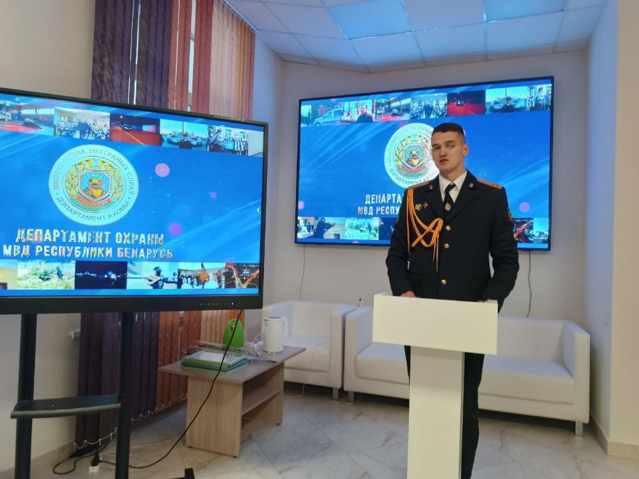 После экскурсии по краеведческой комнате библиотеки, когда гости собрались в актовом зале, начальник Березинского Департамента охраны Даниил Таратин взял приветственное слово, в котором подчеркнул важность службы их сотрудников для граждан. В подтверждение его слов был показан информационный ролик о многогранных функциях Департамента.
