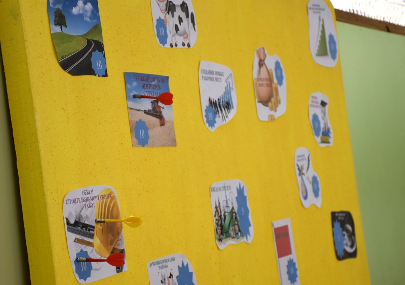 Второй конкурс – метание дротиков по избранным целям. С учётом Года Качества каждая цель символично обозначала одно из стратегических направлений развития, задачей же руководящего состава было определить правильные приоритеты. Привлечение инвестиций, приток молодых специалистов, увеличение объёмов строительно-монтажных работ – это далеко не полный перечень, который присутствовал перед каждым участником.