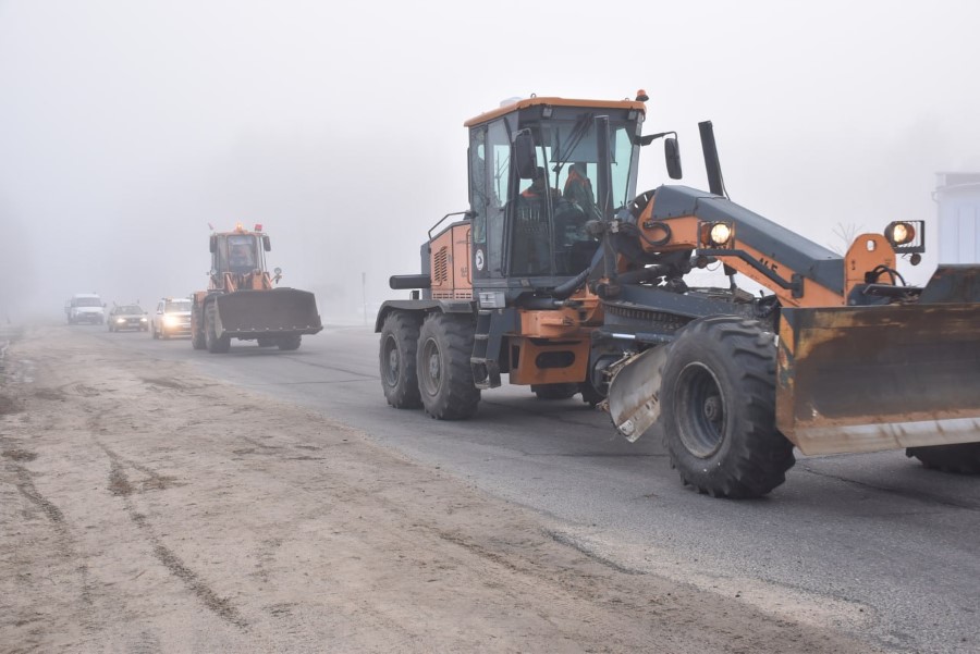 Техника ДРСУ-192 собралась на стоянке возле сырзавода. Тут же дорожники и… молодежь.