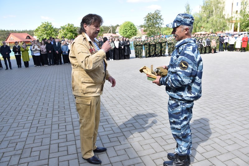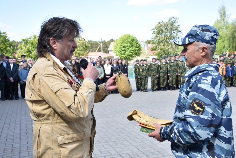 Среди тех, кто поздравлял членов клуба, были исполняющий обязанности по должности начальника Березинского РОВД Александр Викторович. Кроме теплых слов пожеланий он вручил подарок – оружие для того, чтобы ребята практиковали занятия по огневой подготовке. Настоятель храма Преображения Господня Василий Васильков обратился к молитве, чтобы Господь благословил хорошее дело, а затем окрапил всех членов клуба святой водой. Не с пустыми руками пришел и председатель Березинской районной организационной структуры общественного объединения «Белорусский союз ветеранов войны в Афганистане» Олег Купич, который вручил на память клубу фуражку и фляжку, сохраненные им со времен войны в Афганистане, как ценные памятные его душе реликвии. К его словам поздравлений присоединился и председатель Червенской районной организации воинов-афганцев Виктор Казаченок.