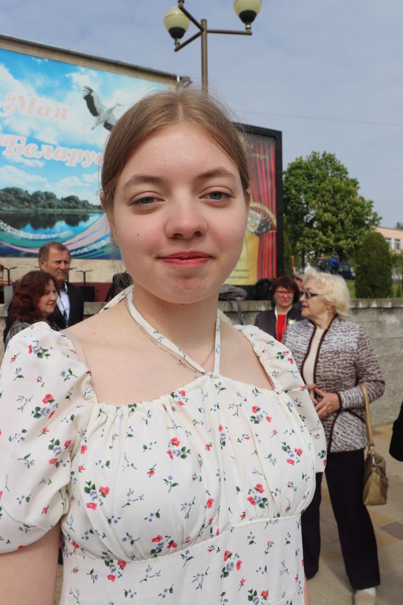 – Участвовать в исполнении Вальса Победы для меня было очень почетно и ответственно. Ведь Победа до сих пор живет в сердце каждого из нас. Именно память и собирает всех нас, белорусов, в этот день для того, чтобы еще раз вспомнить о Великой Отечественной войне, ее жертвах и героях, проникнуться ухом благодарности за мирное небо и духом патриотизма. Присущ он и мне. И я после окончания в этом году гимназии хочу связать свою жизнь с защитой порядка в нашей стране и стать курсантом Академии Министерства внутренних дел. Мы должны беречь мир, который нам подарили наши деды и прадеды.