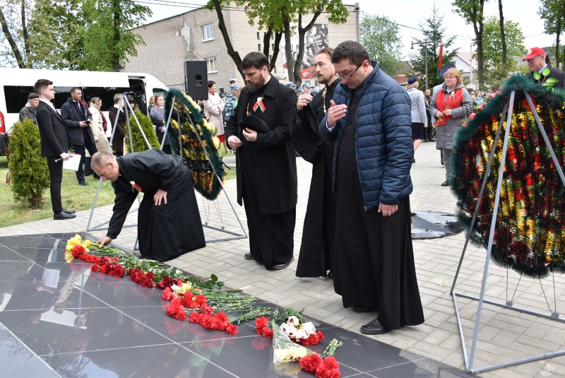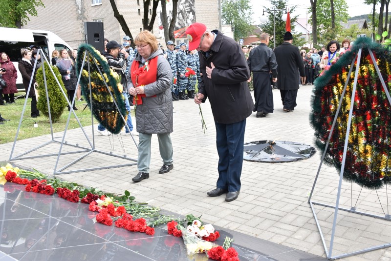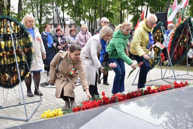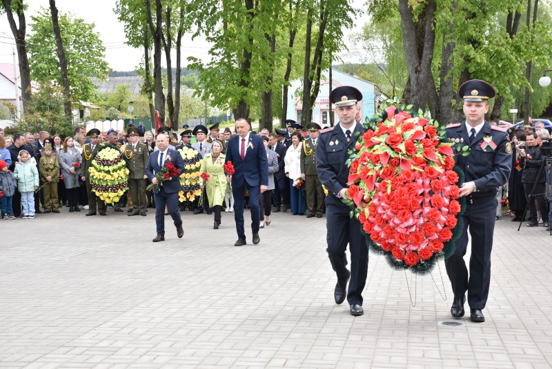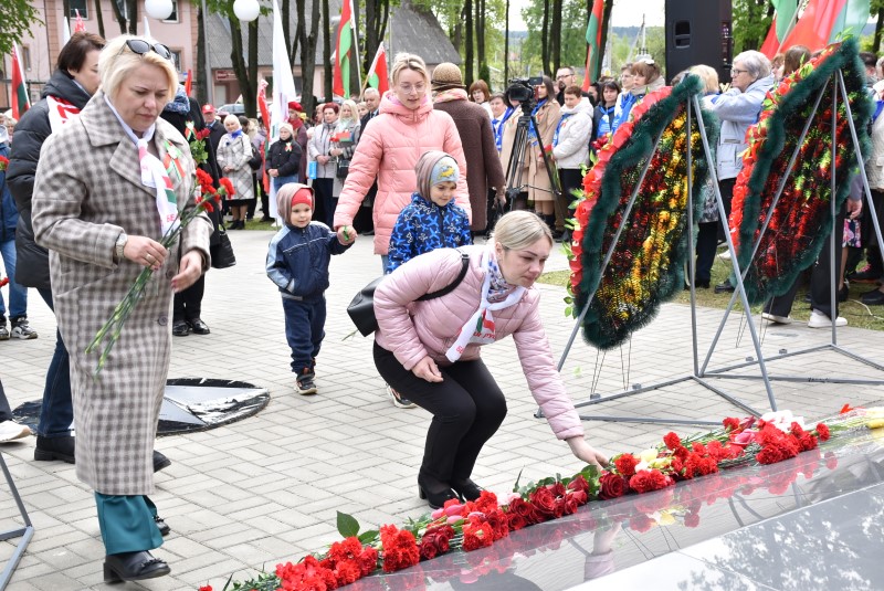 Затем к подножию памятника нескончаемой вереницей возлагаются венки и цветы: от районного исполнительного комитета и районного Совета депутатов; от районного совета ветеранов; от общественных объединений и политических партий, молодежи и религиозных организаций; от руководителей предприятий и организаций; от жителей города и всех желающих.