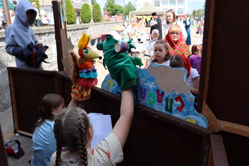 Театральной постановкой «Гуси-лебеди» поздравили с Пасхой присутствующих учащиеся воскресной школы Никольского храма.