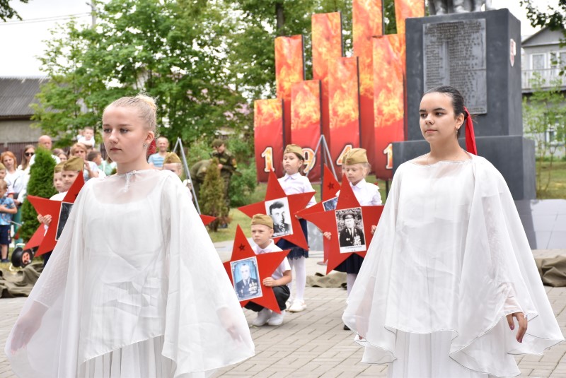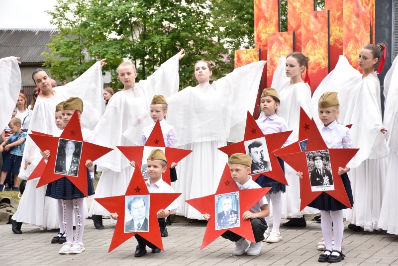 Сложно сдержать слезы. Проникновенный номер «Журавли» ансамбля танца «Вяселка», где в конце маленькие березинцы вынесли портреты жителей района — героев Великой Отечественной войны.
