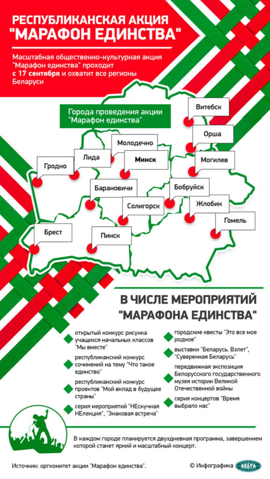 Как сообщалось ранее, над реализацией идеи “Марафона единства” команда профессионалов работала давно. О старте республиканской общественно-культурной акции “Марафон единства” объявил Президент Беларуси Александр Лукашенко на патриотическом форуме 17 сентября.