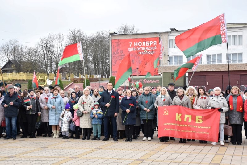 Вось і сёння на цэнтральнай плошчы горада з нагоды 107-й гадавіны Вялікага Кастрычніка сабралася нямала прадстаўнікоў грамадскасці, вытворчых калектываў, а таксама раённага выканаўчага камітэта, каб у чарговы раз аддаць даніну павагі гэтай гістарычнай падзеі. Адкрыў мерапрыемства зваротам да прысутных і віншаваннем са святам старшыня раённага Савета дэпутатаў Уладзімір Трухан. Своеасаблівы экскурс у гісторыю тых даўніх падзей і наступстваў, якія абумовілі далейшы ход развіцця Бярэзіншчыны, зрабіла супрацоўніца раённай бібліятэкі Тамара Круталевіч.
