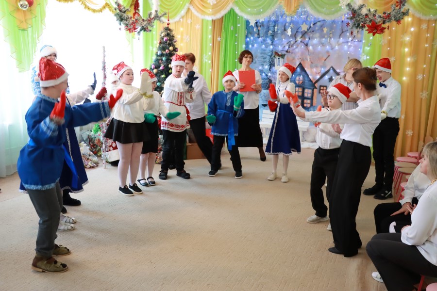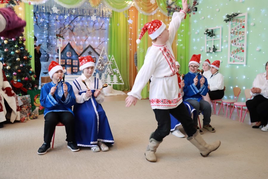 Дети показали народный танец «Казачок», рассказали стихи, загадали загадки Деду Морозу и затем все вместе водили хоровод.