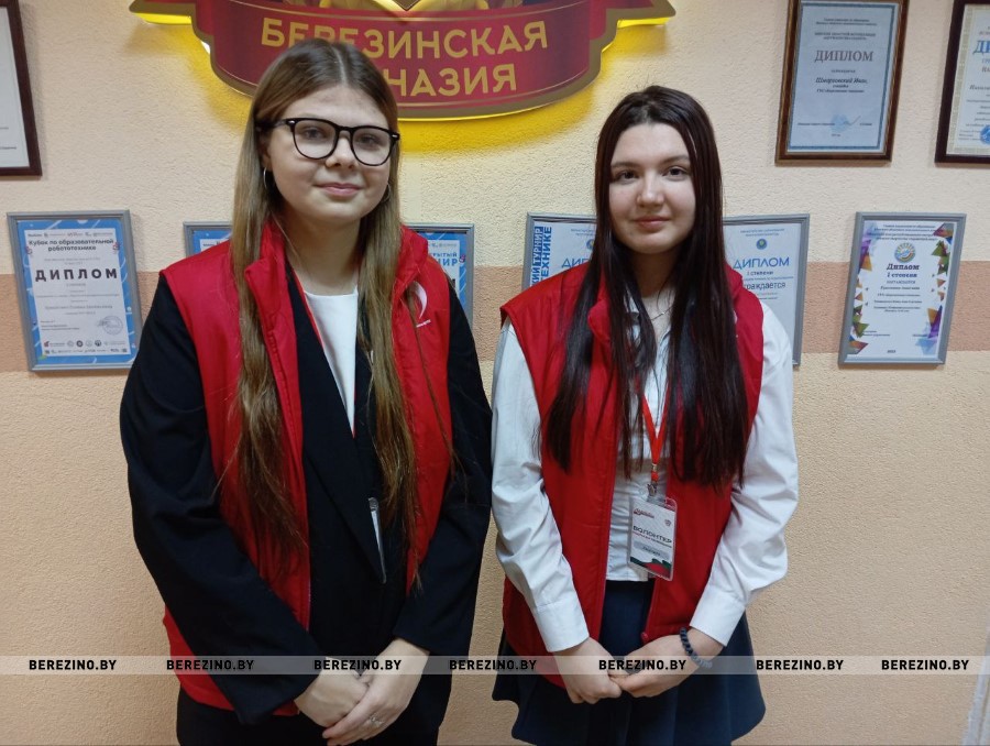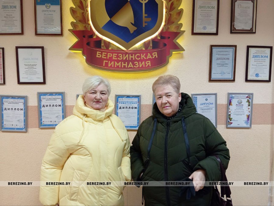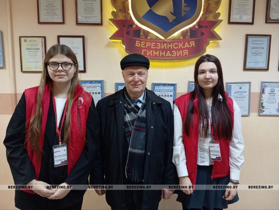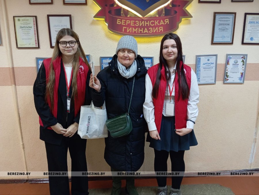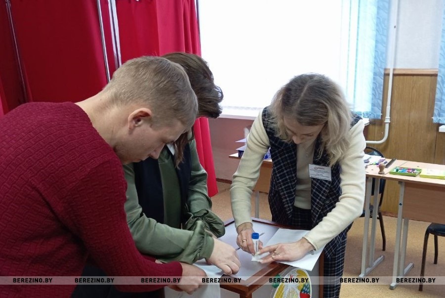 На участке номер три в Березинской гимназии сегодня многолюдно с самого начала досрочного голосования. Здесь оформлен уголок избирателя, дежурят милиционеры и волонтёры БРСМ Кира Жданович и Анна Драница.