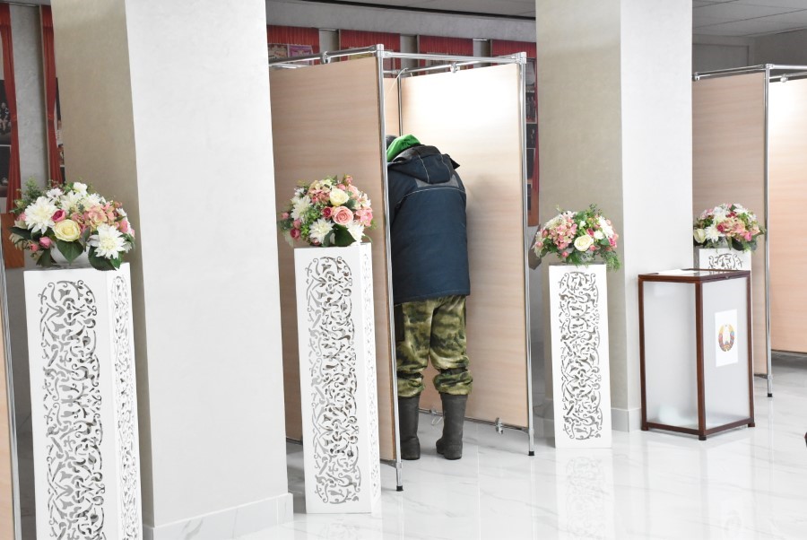 Голосование проходит на втором этаже, вниманию голосующих подготовлен уголок избирателя, фотозона. Голосование с самого утра, можно сказать, идёт активно.