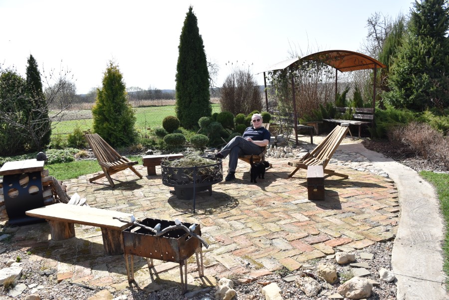 Стационарный очаг для костра можно также сделать из бетона своими руками. Проще, конечно, купить готовую стальную костровую чашу. Я покупала чашу «Gala», производитель Борисовский завод. Костровые чаши являются прекрасной современной альтернативой классическому костру. Здесь же расположена дровница, на неё я положила дощечку, получился столик, а на столик установила металлического котика, который смотрит вниз, как будто проверяет, достаточно ли дров в дровнице?! Рядом – поленница с топором. Каждая деталь – на своём месте. Костровую зону нужно обязательно делать с учётом правил пожарной безопасности.