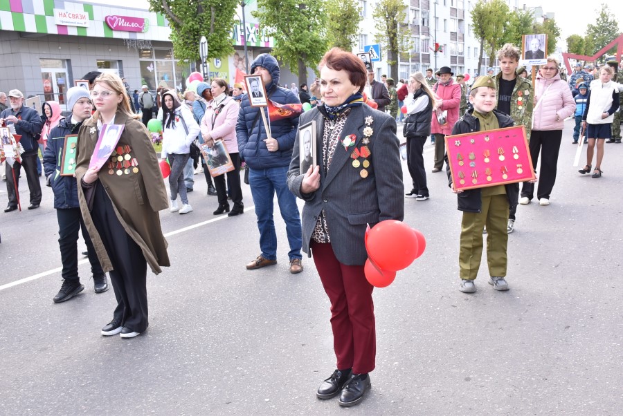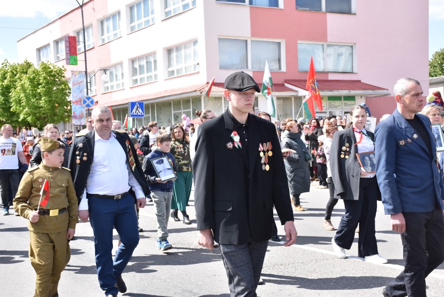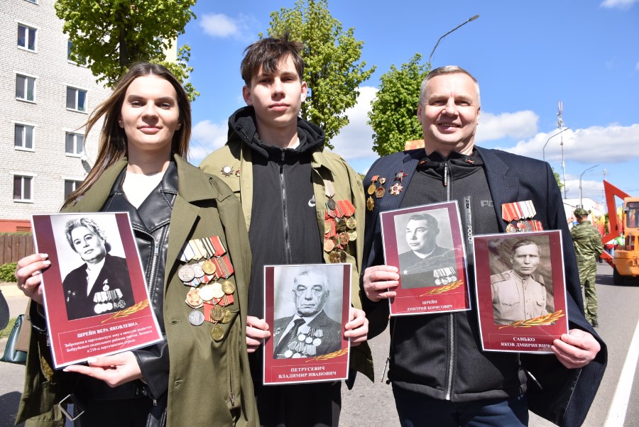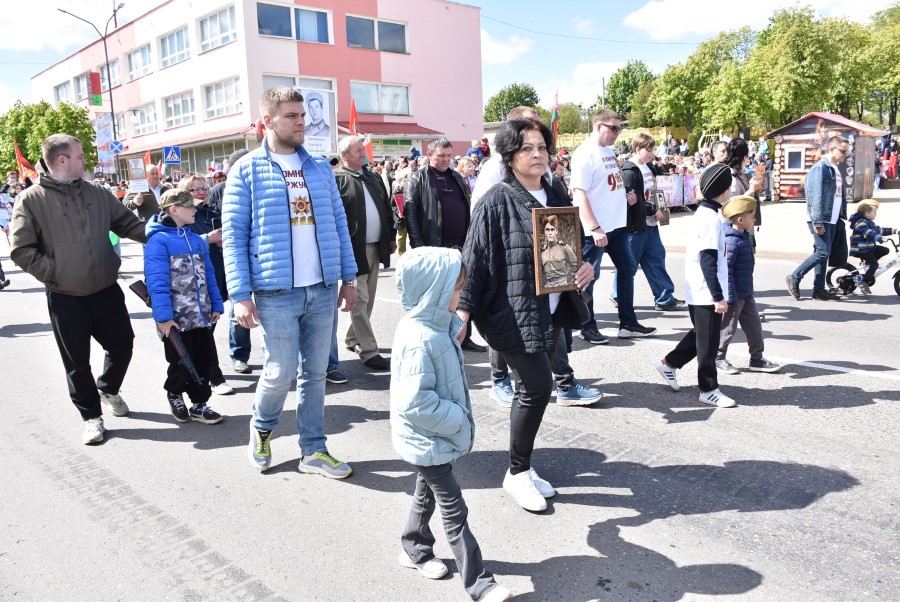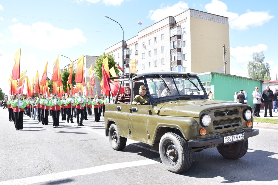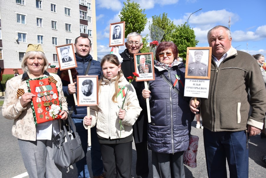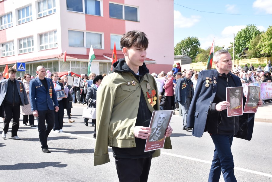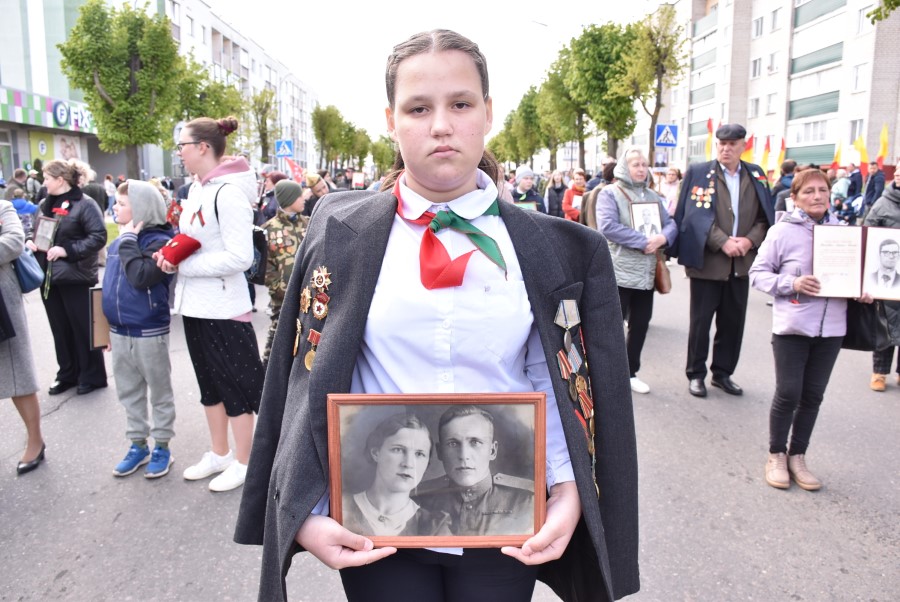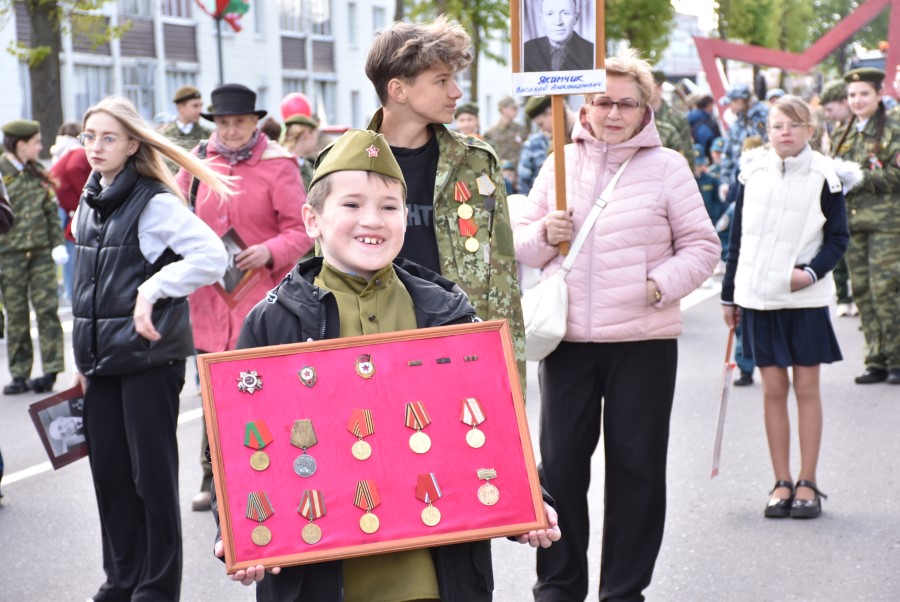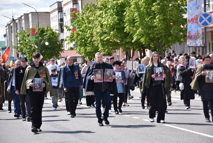 Именно такими словами начиналось театрализованное представление на городской площади в тот день. Но не только мальчишки и девчонки в пиджаках не по росту (их все-таки достали со шкафов!) с боевыми наградами в танце представляли образ памяти о своих прадедах. Фотографии бывших участников войны, своих близких и родственников, несли в руках многие березинцы, образовав колонну «Бессмертного полка». На всю площадь звучат их гордые имена и совершенные ими подвиги. А вот (в это даже не верится, ведь прошло уже 80 лет!) и живой свидетель и участник тех событий – единственный, последний участник войны Березинщины София Петровна Стасевич. В этом году она отпразднует свой вековой юбилей. Есть что вспомнить ветераны, что рассказать молодежи, чем поделиться. Громкими аплодисментами встречали гости праздника Софию Петровну, а председатель Березинского райисполкома Андрей Соколовский преподнес почетному гостю огромный букет цветов. В знак благодарности за подвиг. В знак памяти.