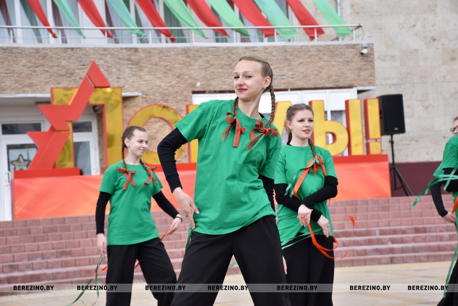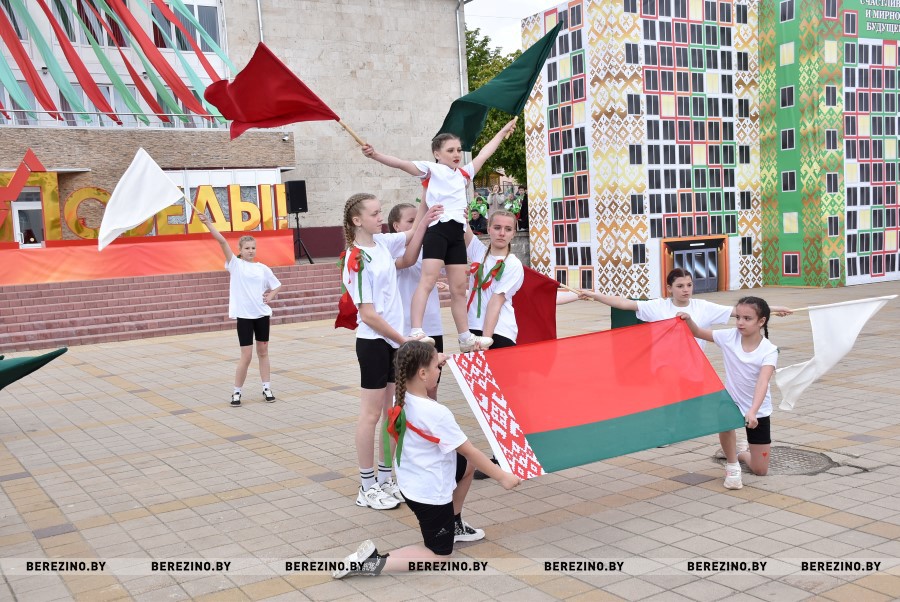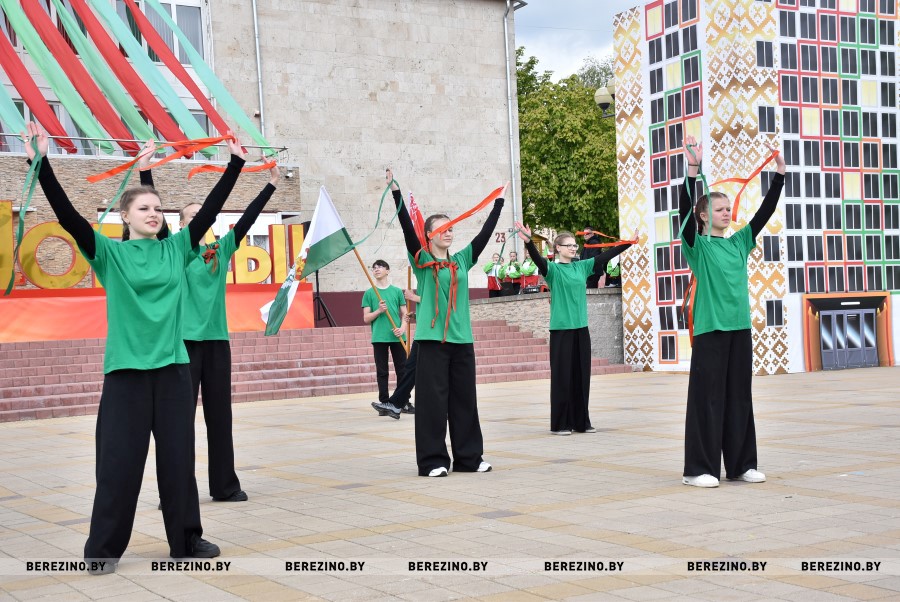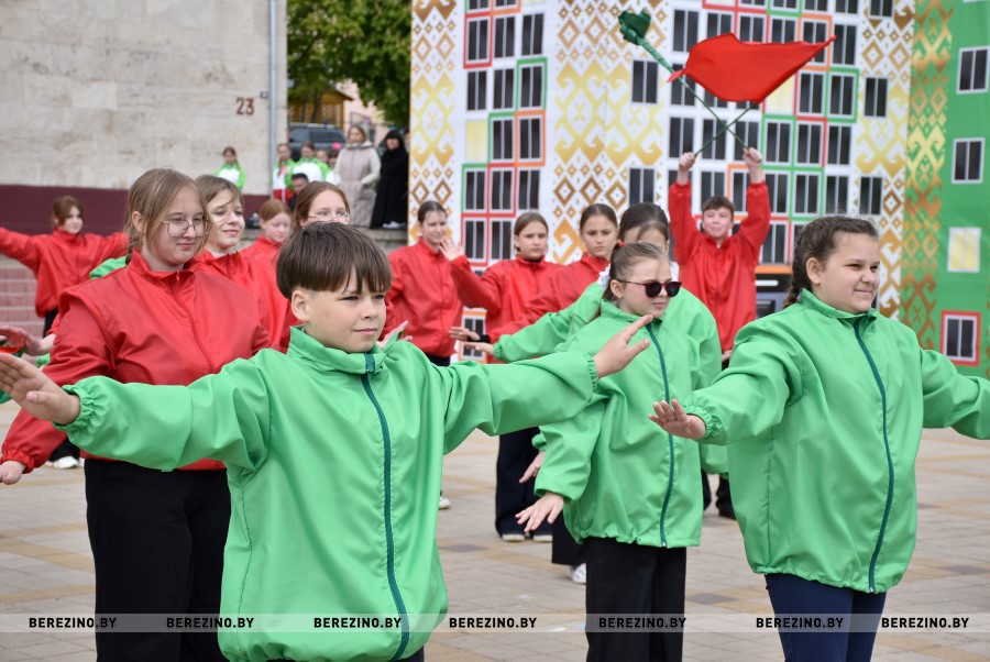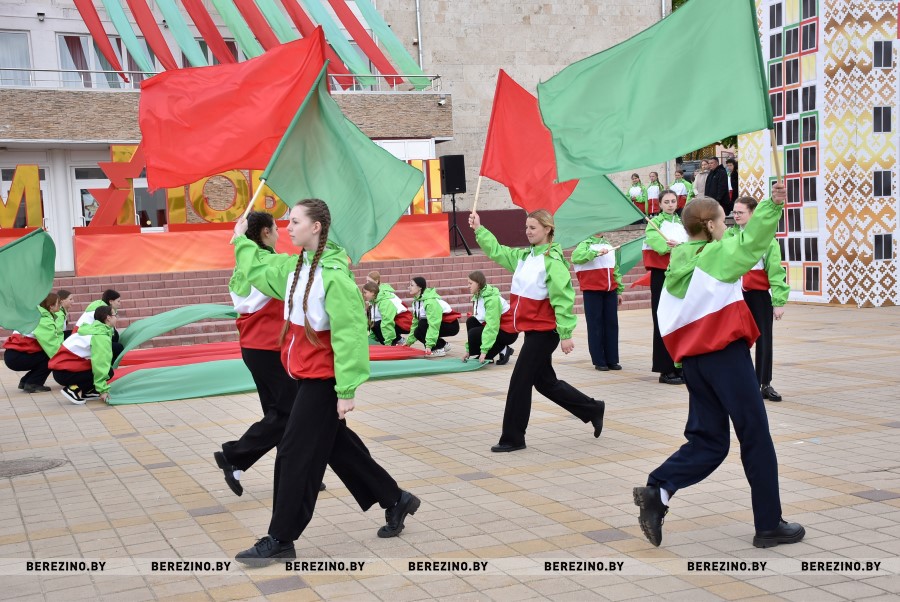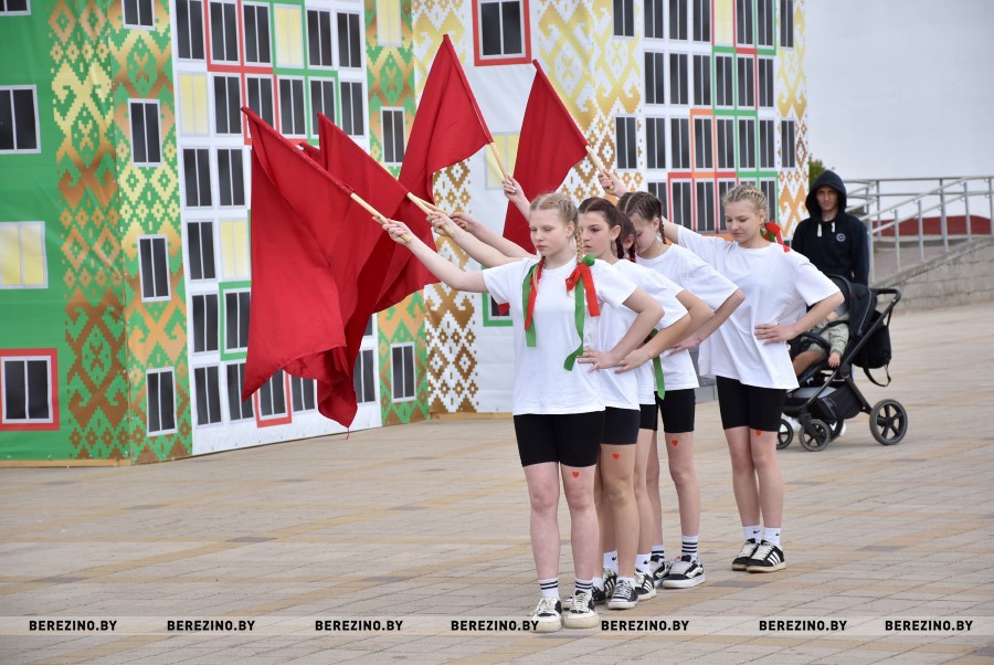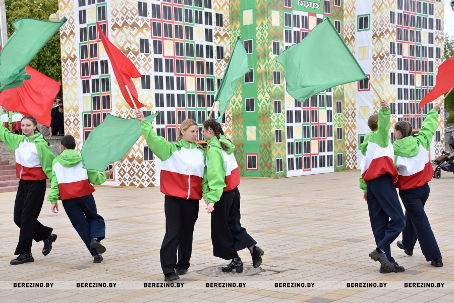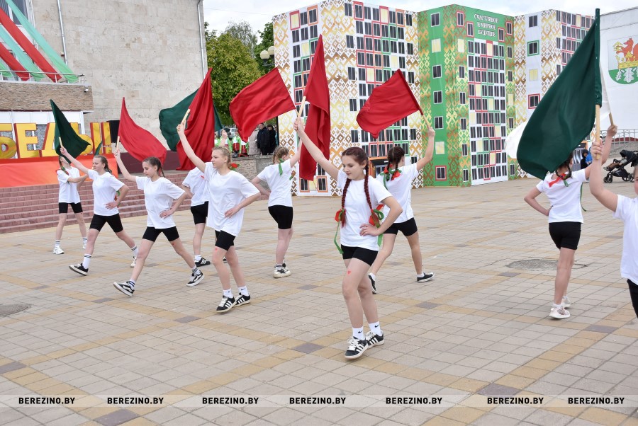Затем состоялся флэш-моб, посвящённый праздничному дню. Ученики Березинской гимназии, Капланецкой и Поплавской школ, а также средней школы №2 г.Березино выступили с номерами флаг-шоу.