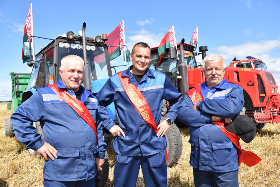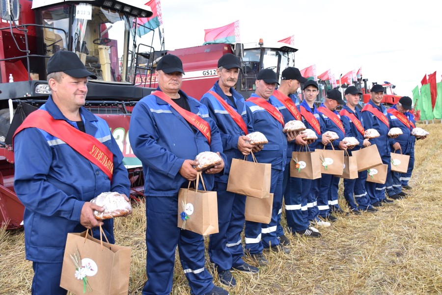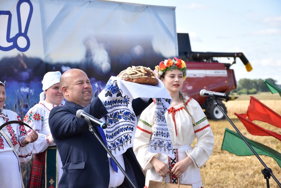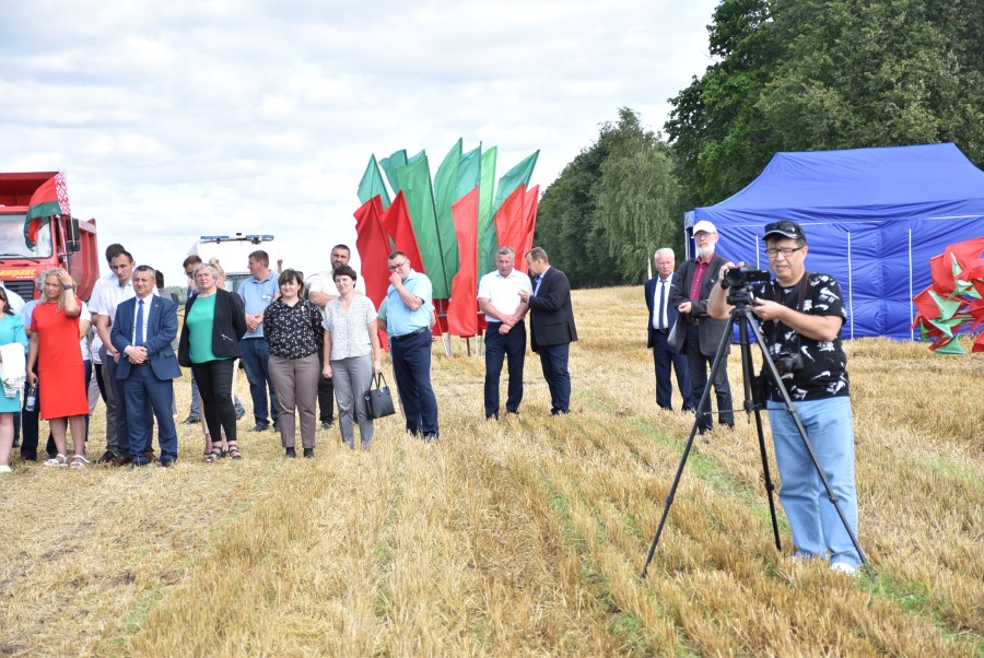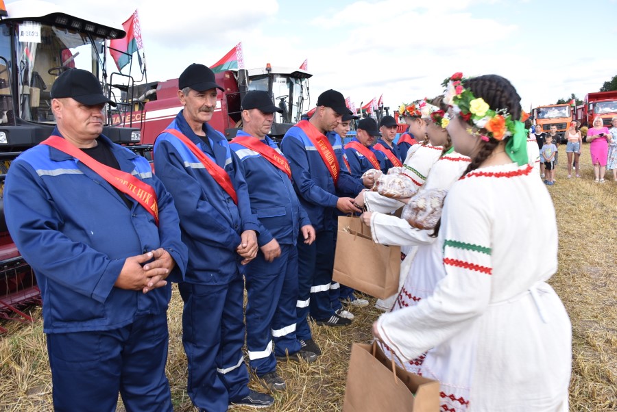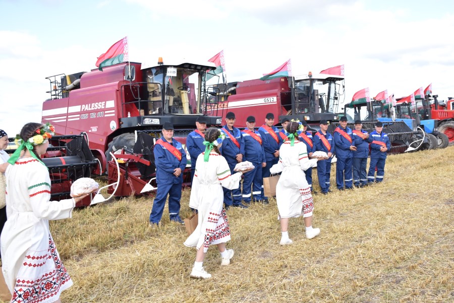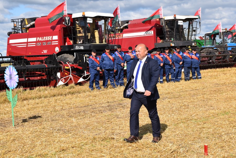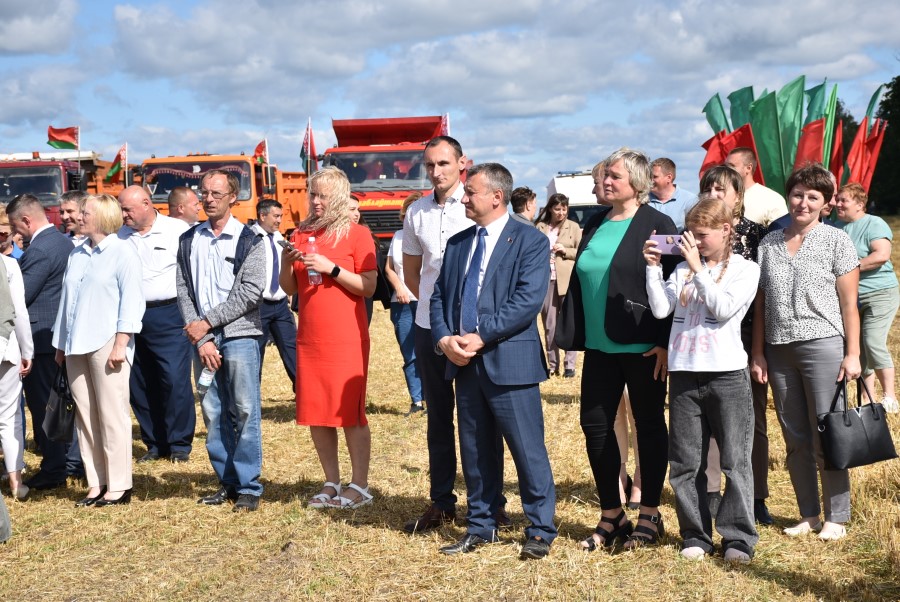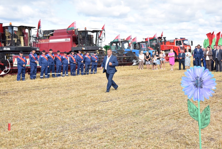 Но хватит уже ядреной ржи стоять в поле. Пора начать убирать созревшие хлеба, дать официальный старт жатве, а первому комбайну намолотить первые центнеры свежего зерна. Почетная миссия первыми выйти в поле предоставляется председателю райисполкома Андрею Соколовскому и комбайнеру ОАО «Погостский» Александр Ермолович. И вот комбайн плавно отправляется в путь. Пусть сегодня он лишь условный, недолгий. Но завтра, да и в последующие дни жатвы, именно они, могучие комбайны и управляющие ими комбайнеры, станут главными действующими лицами, главными тружениками и добытчиками хлеба, нашей надеждой на зажиточную жизнь. В добрый путь, хлеборобы! Спасибо вам за ваш труд. И пусть будет он благославенным, приносящим вам радость и трудовые победы!