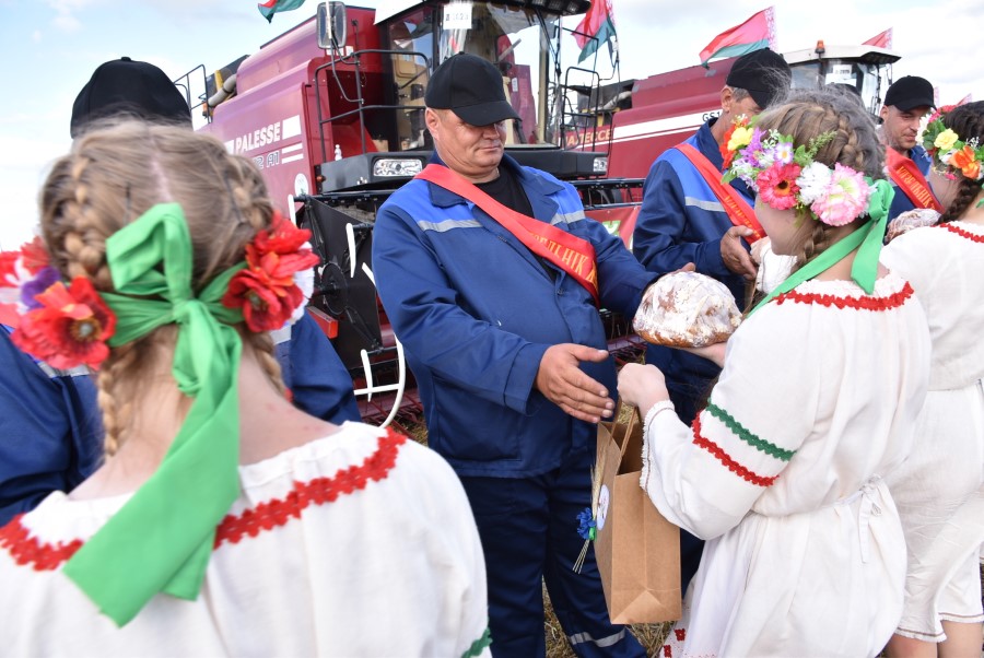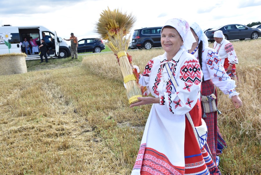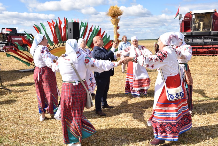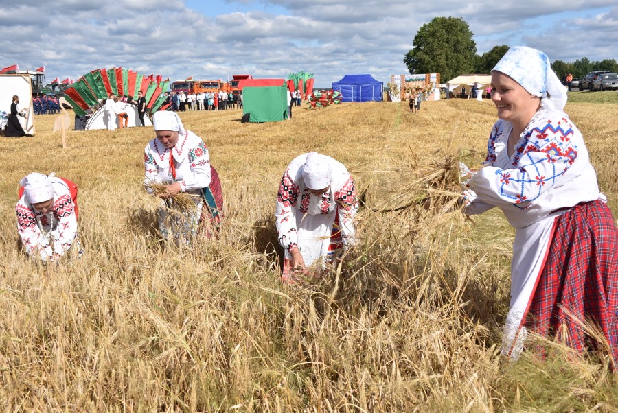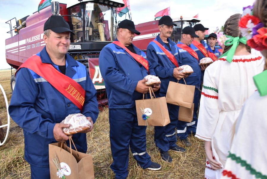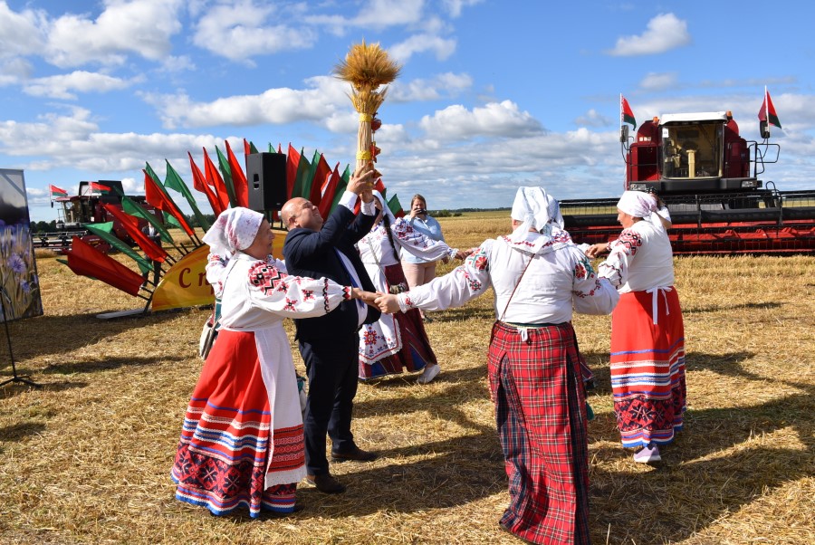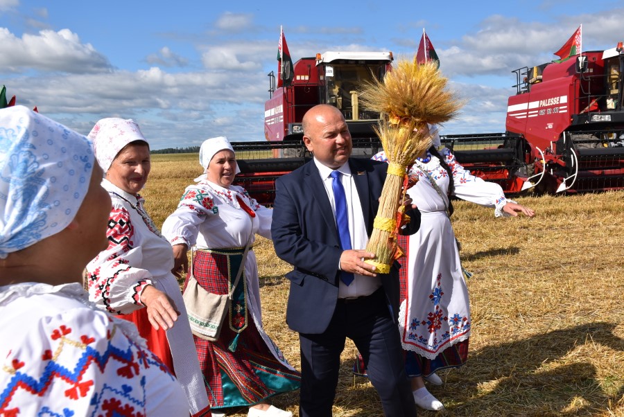 И вот наступает пора жницам по-старинке, серпами, с песнями начинать зажинать уже выспевшее зерно, чтобы затем сделать из него первый зажиночный сноп «на сто коп, на тысячу мерак. Вышэй снапок ад гары и яснейшы ад зары». Вот он – весомый, колосистый, золотой – взлетает в руках Андрея Соколовского высоко в небо. И пока Андрей Валентинович подбрасывает его, все загадывают, чтоб прошла жатва без потерь, чтобы техника не ломалась и чтобы Бог дал здоровья всем участникам жатвы.